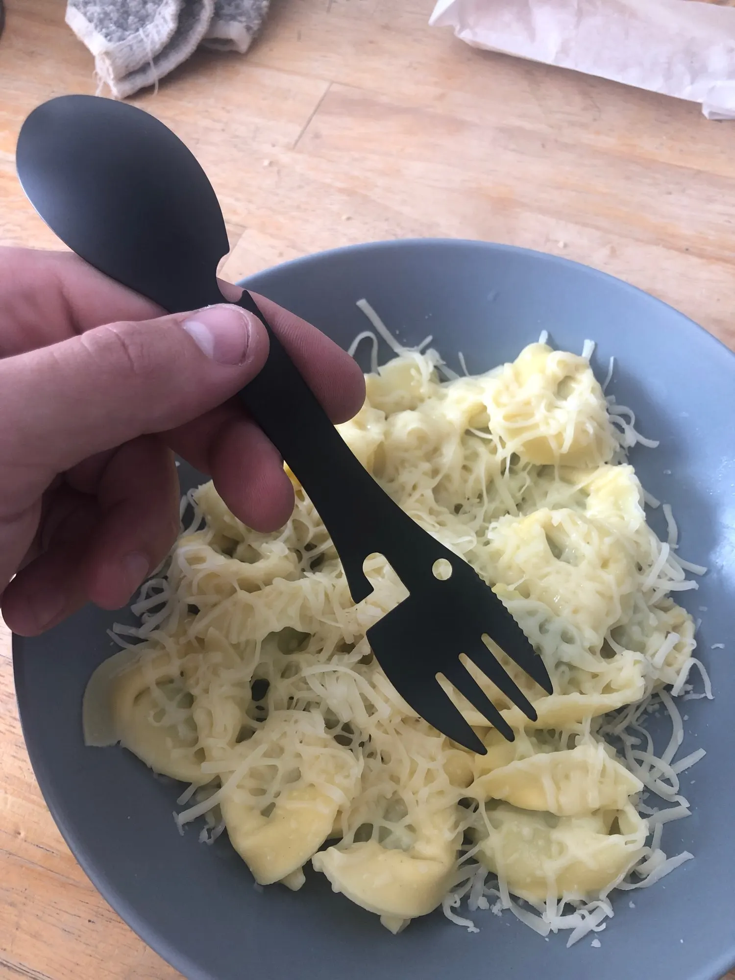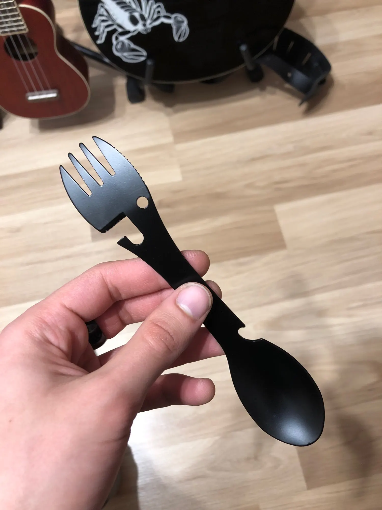 Ложка по размеру как десертная, а по полезному забору супчика, как чайная. Вилка сделана так, что проще ложкой. Открывашку не испытывал, но на нее расчитывать в лесу не стоит. Она конечно откроет (скорее всего), но скорее всего придется доробатывать. Сам девайс тяжеловат- не фольга. На рыбалку пойдет.
