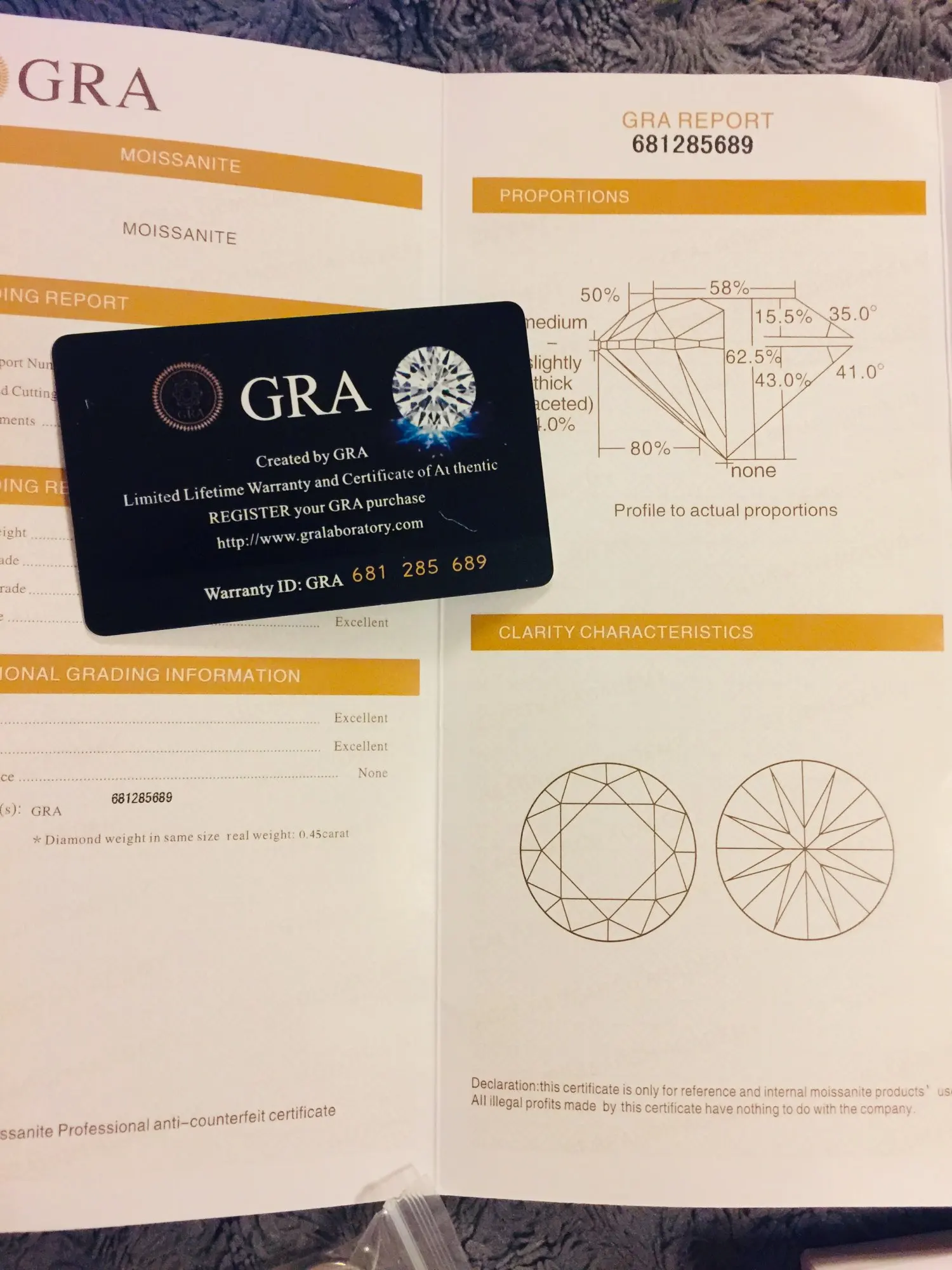 Выглядит отлично! Покрыто покрытием из розового золота с дополнительной платой. Моиссанит пришел с GRA сертификатом, за который я заплатил (и он работает), но на moissanite нет номера (продавец сказал, что только из одного карата и выше)