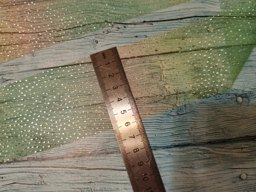 Длину не измерял. По ширине 6см. Немного мягкий фатин. Но в целом, хороший товар. Отправка быстрая. Получил через 3,5 недели