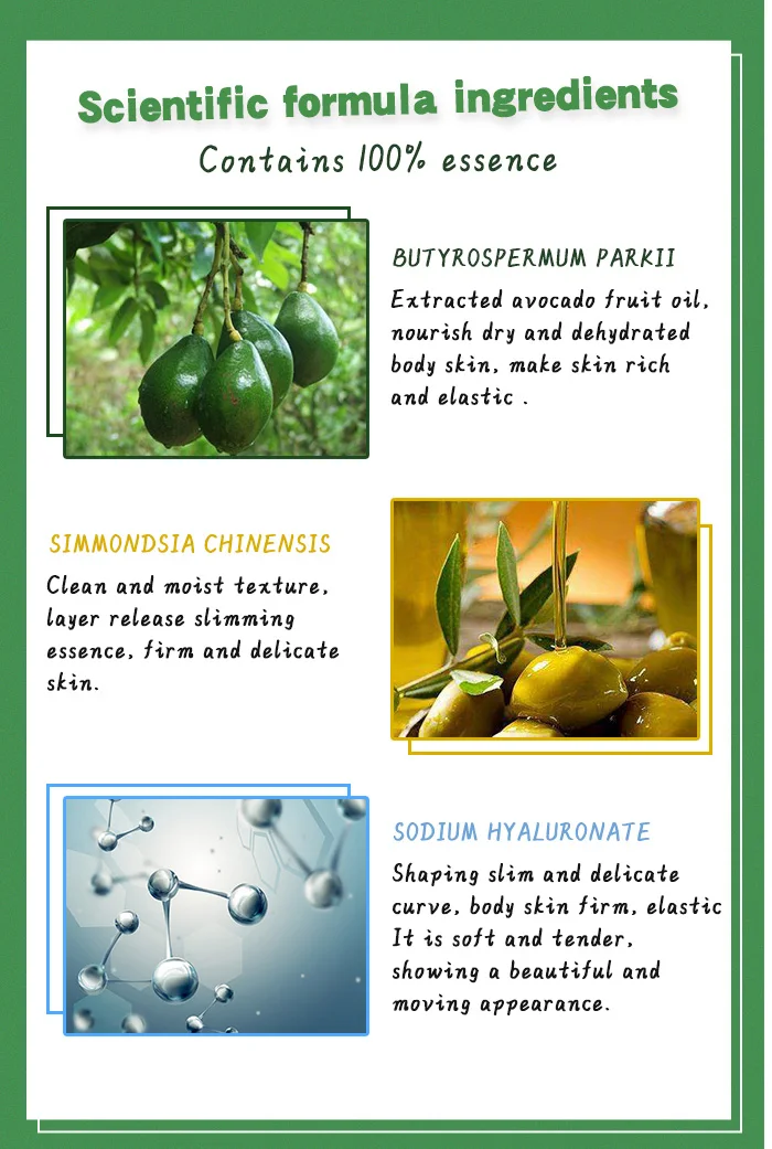 Экстракт фруктового масла авокадо питает сухую и обезвоженную кожу тела, делает кожу богатой и эластичной.