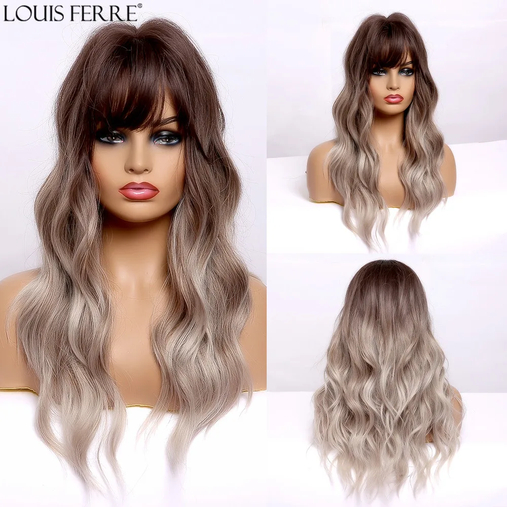 Луи Ферре длинные натуральные волны Омбре коричневый серый пепельный блонд синтетические парики с челкой для черных женщин Косплей жаростойкое волокно