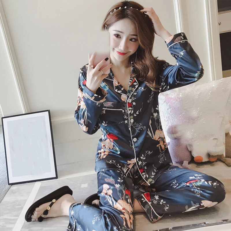 Женская шелковая атласная пижама, пижамный комплект с цветочным принтом, одежда для сна с длинным рукавом, Пижамный костюм, женская ночная рубашка из 2 предметов, одежда для отдыха