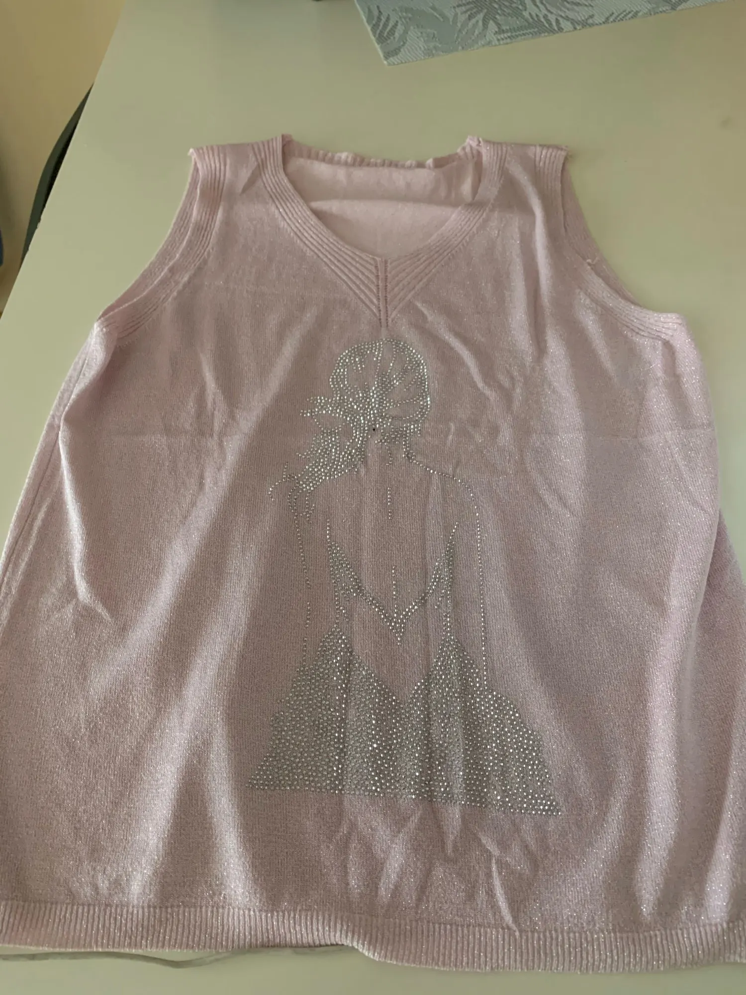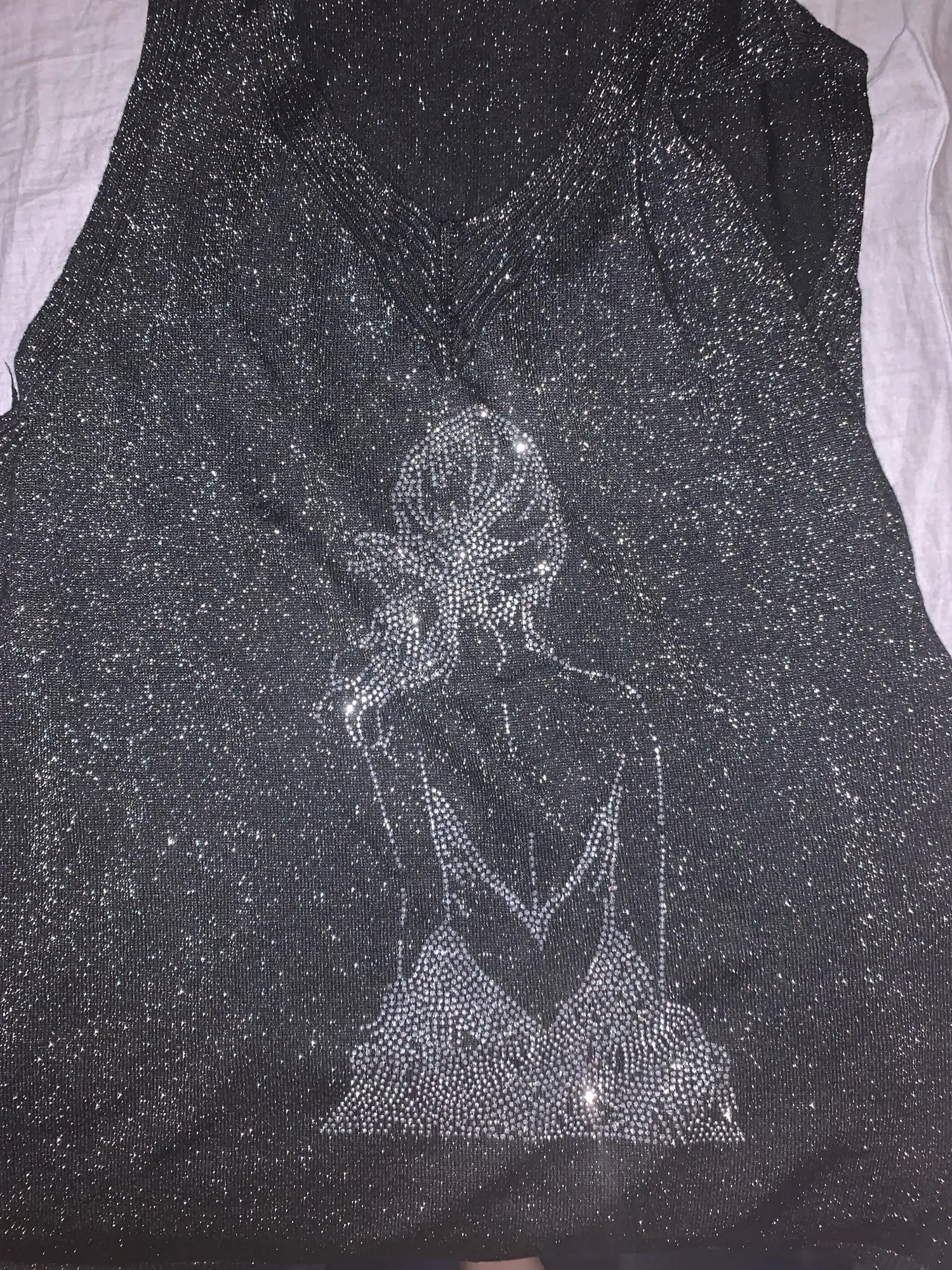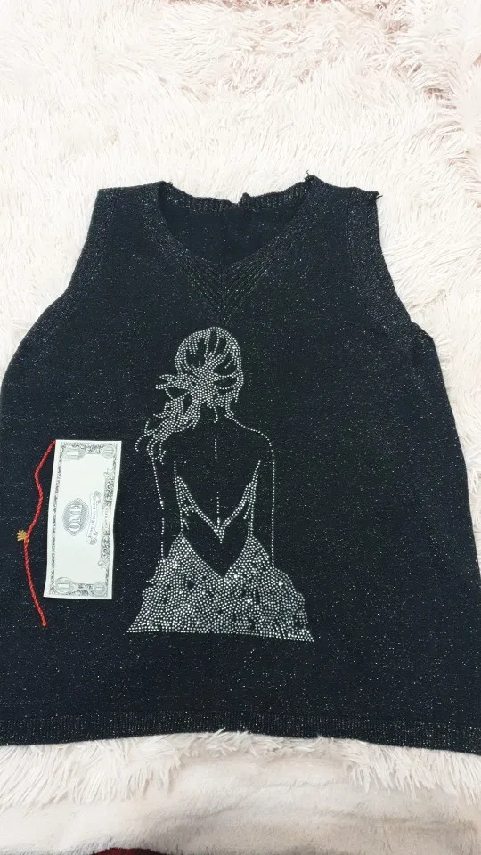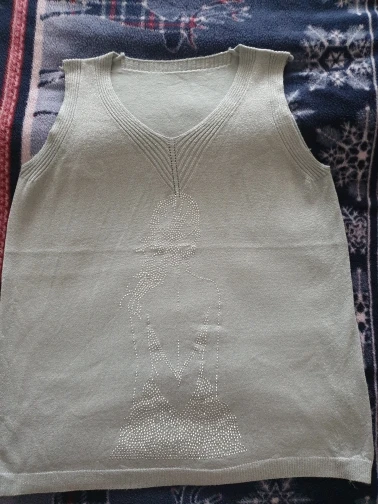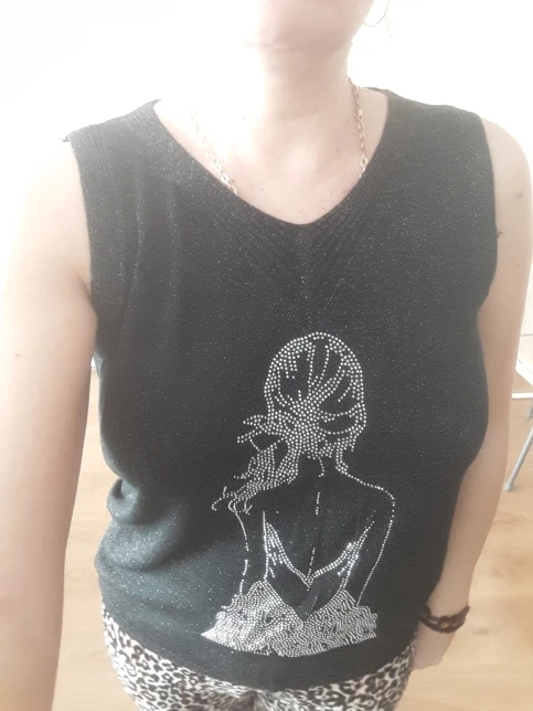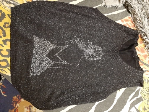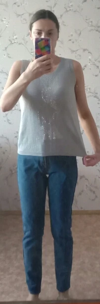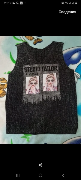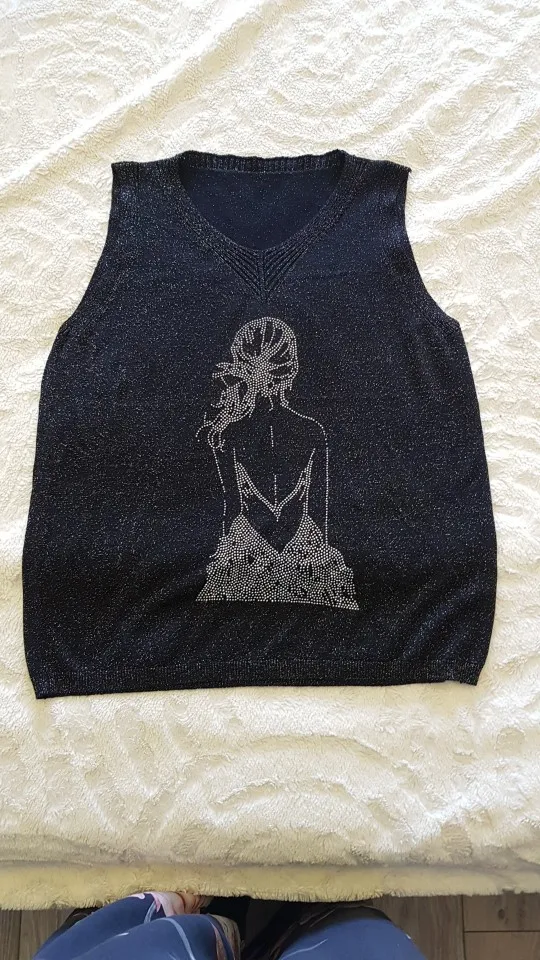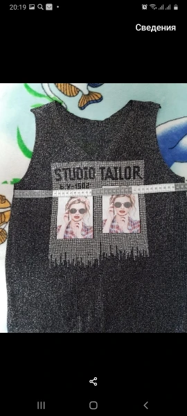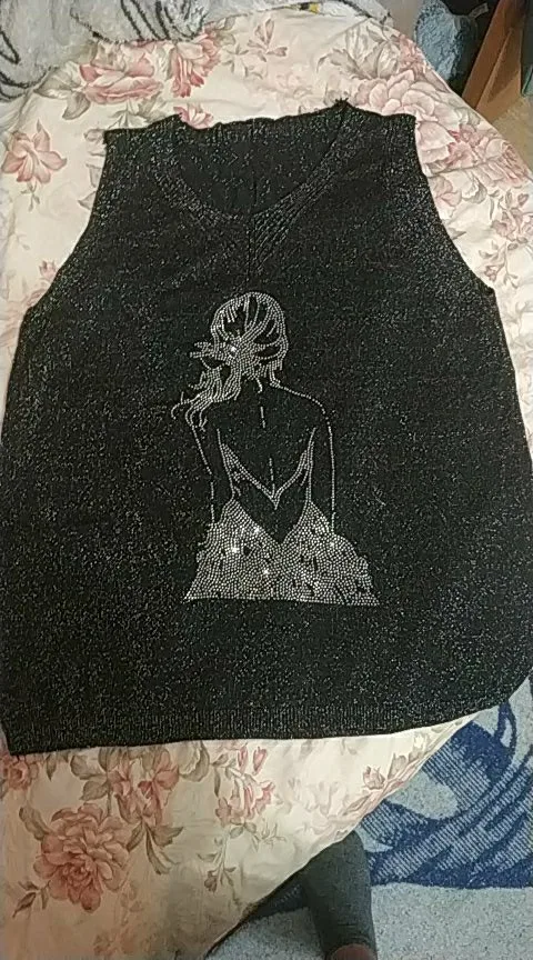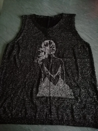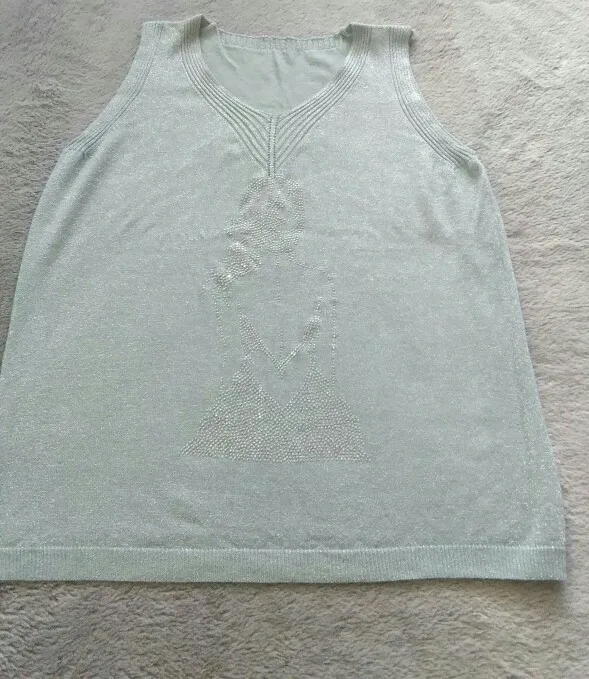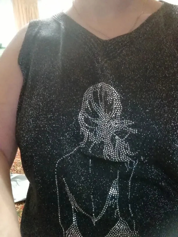 Топ с люрексом,девушка из страз наклеена.Длинна 58см,по груди 46см.Цвет светло серый в зеленцу.Мой рост 175см,Ог90см -села свободно.При выборе смотрите на цвет картинки,надпись под ней перепутана.На лето сойдет или весну под жакет.