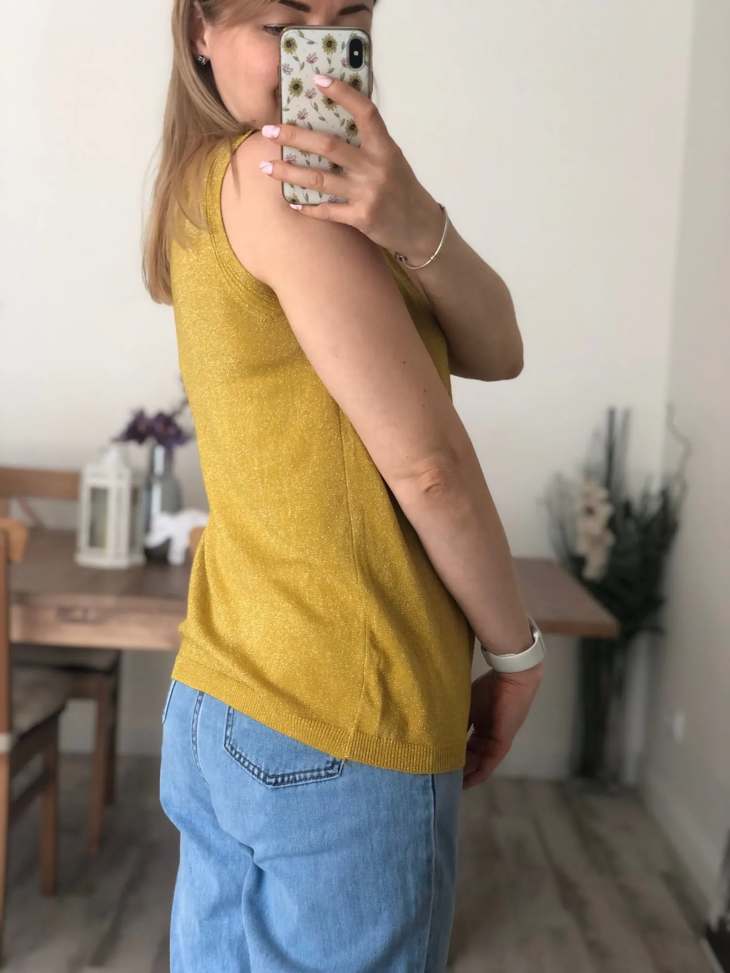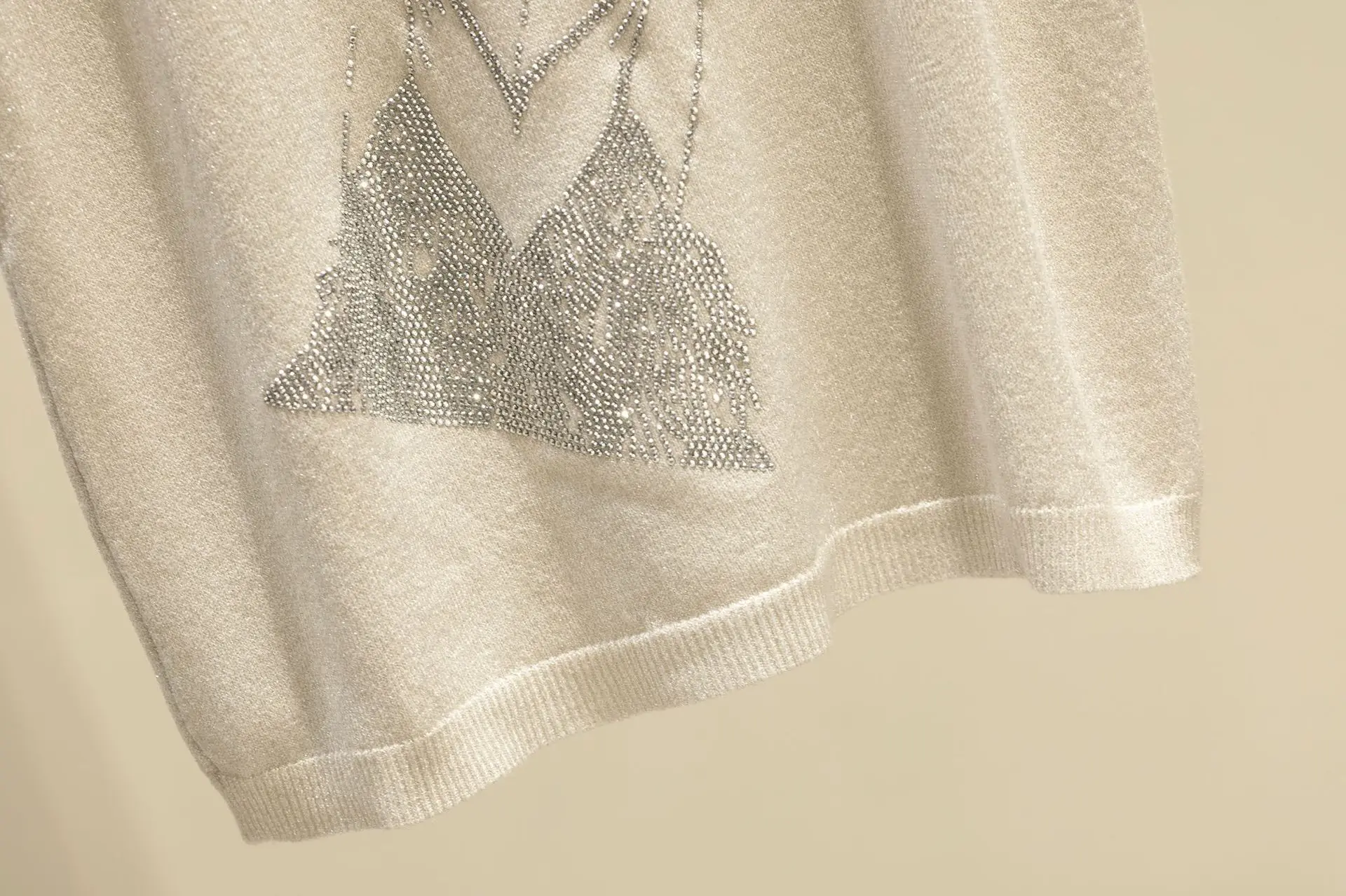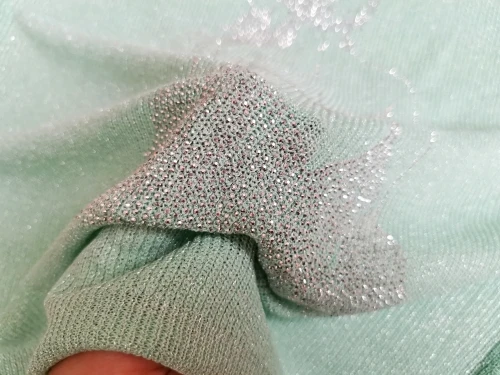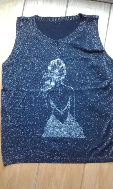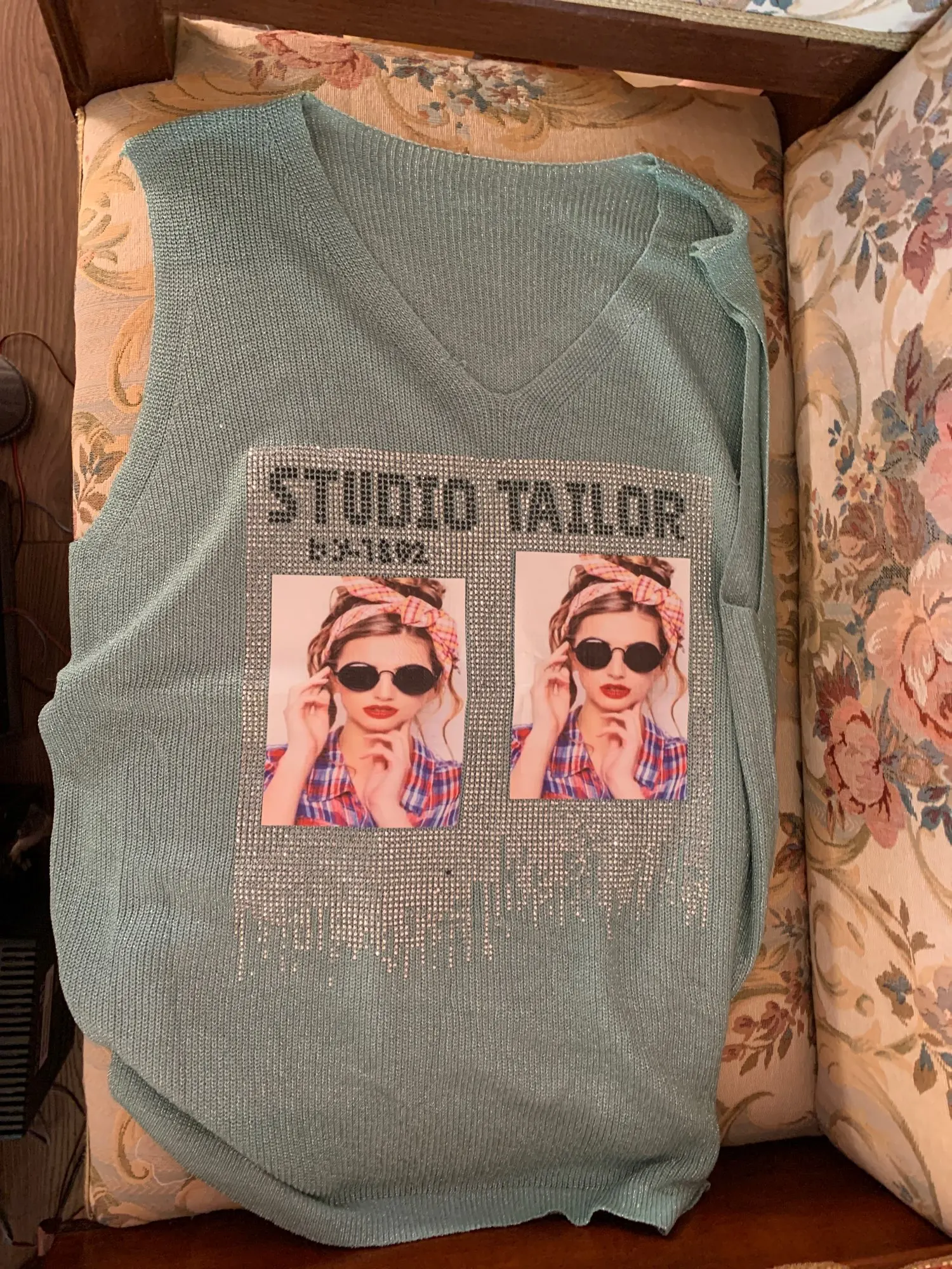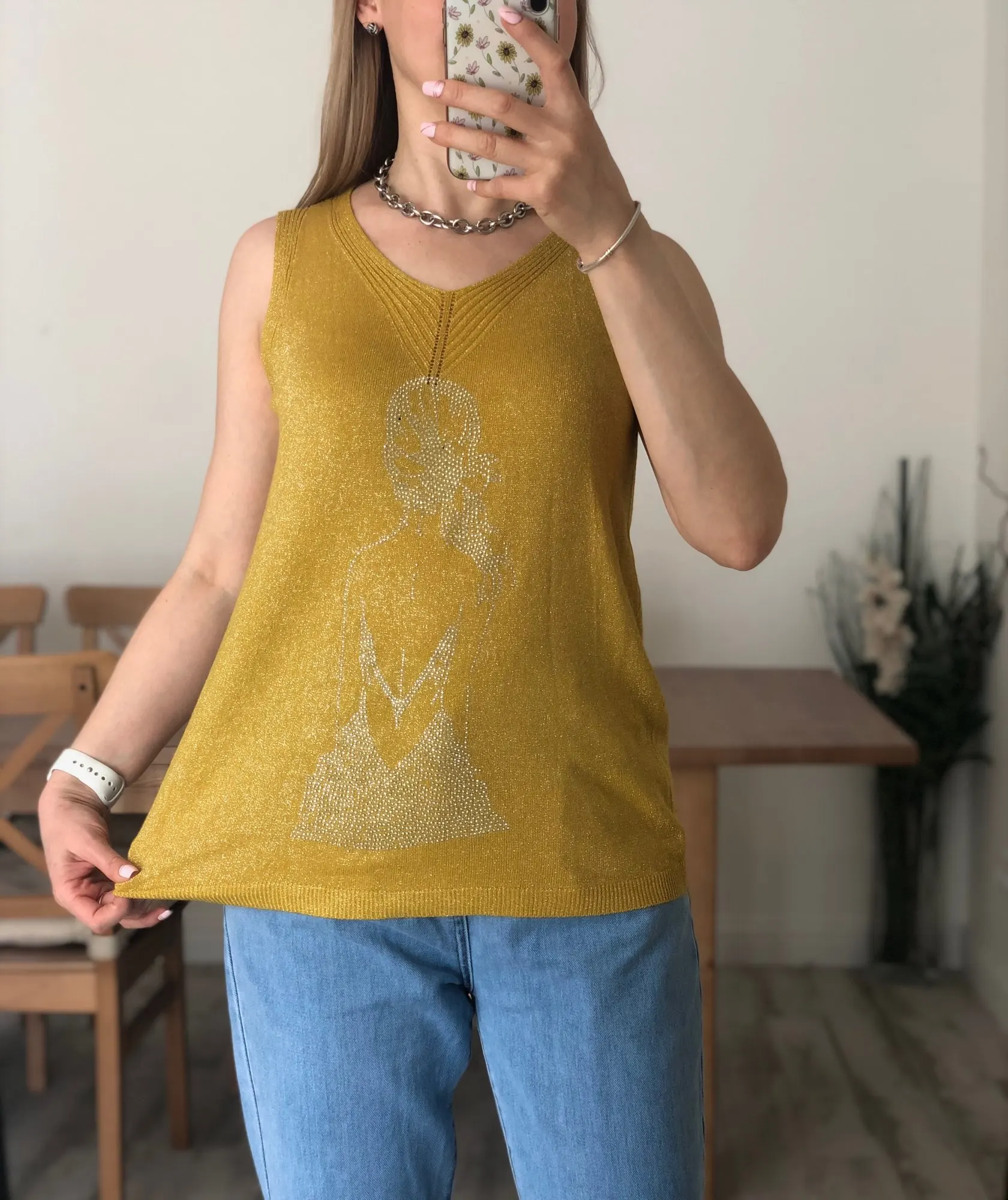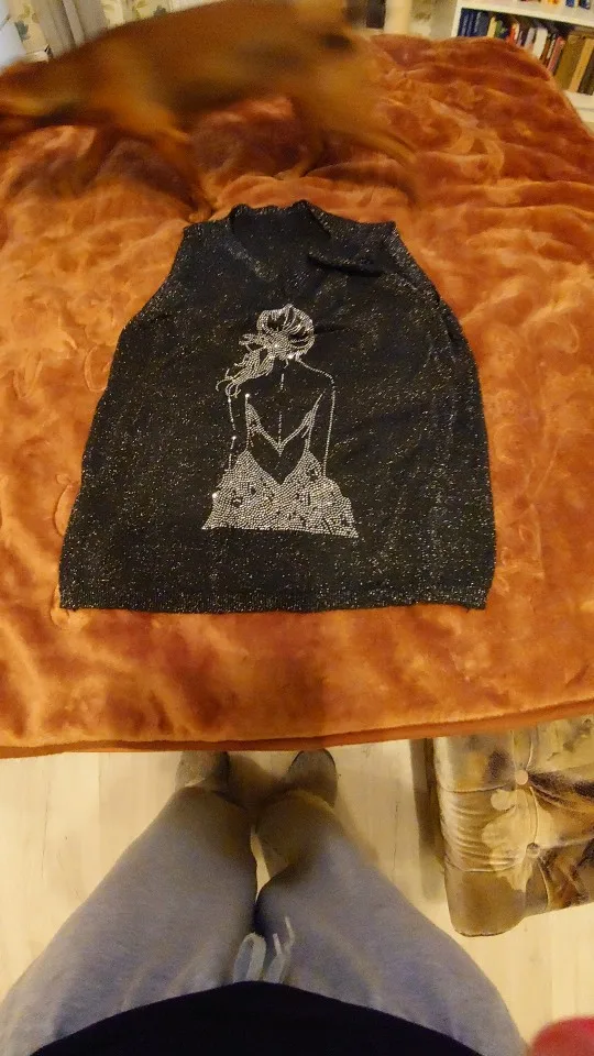 Топ с люрексом,девушка из страз наклеена.Длинна 58см,по груди 46см.Цвет светло серый в зеленцу.Мой рост 175см,Ог90см -села свободно.При выборе смотрите на цвет картинки,надпись под ней перепутана.На лето сойдет или весну под жакет.