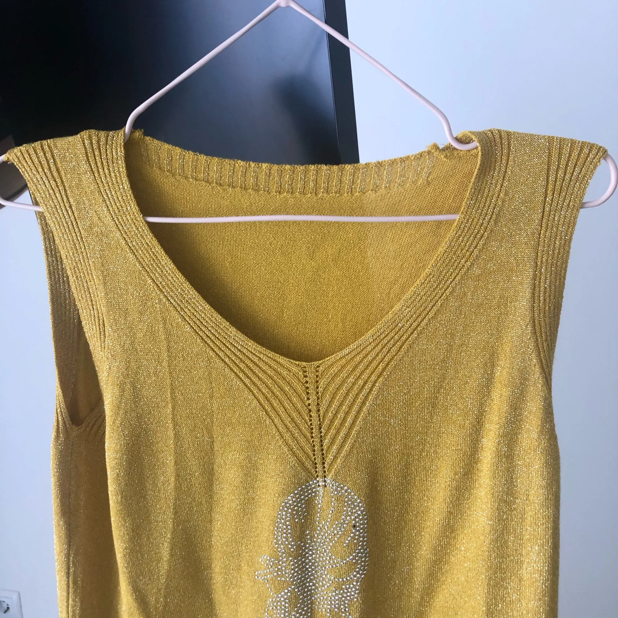 Хороший топ, аппликация камушки, яркие. На 48 русский свободно