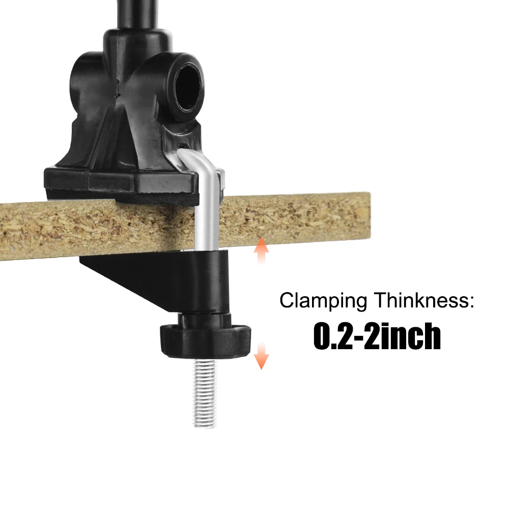 1. Прочный металлический зажим может быть закреплен на любой плоской поверхности толщиной менее 2 ''/ 5 см (макс.). Экономит место, удобно крепится к столу, верстаку.