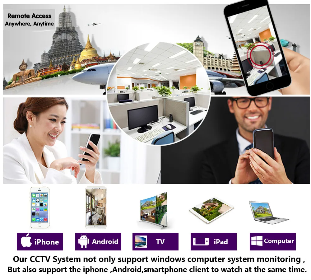 Простая настройка, всего 4 шага для просмотра на мобильный телефон,Просмотр видео в режиме реального времени в системе из любого места и в любое время с помощью смартфона, стола или ПК с передовой технологией P2P, вы можете получить удаленный доступ к вашей системе в течение нескольких минут или меньше, нет необходимости в переадресации, удаленный доступ никогда не был таким простым!