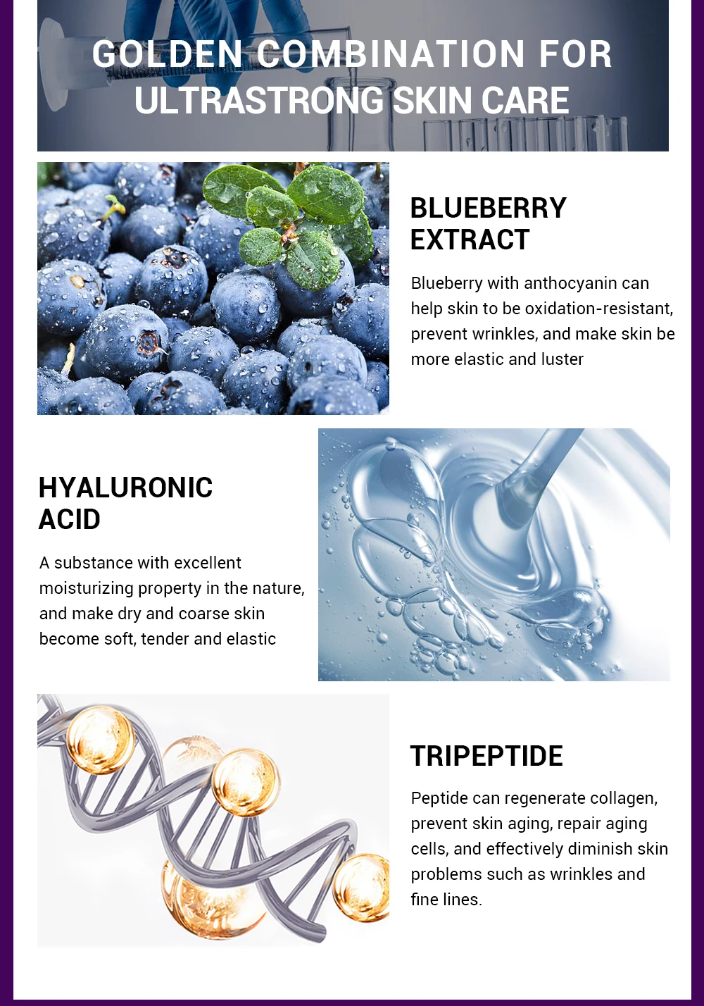 Экстракт черникиЧерника с антоцианином помогает коже быть стойкой к окислению, предотвращает появление морщин и делает кожу более упругой и сияющейГиалуроновая кислотаСредство с превосходным увлажняющим свойством в природе, делает сухую и грубую кожу мягкой, нежной и эластичнойТрипептидПептид может регенерировать коллаген, предотвращать старение кожи, восстанавливать старение клеток и эффективно уменьшать проблемы с кожей, такие как морщины и мелкие морщинки.