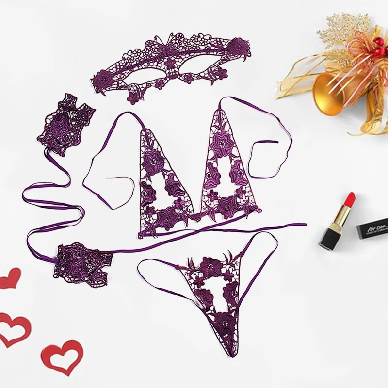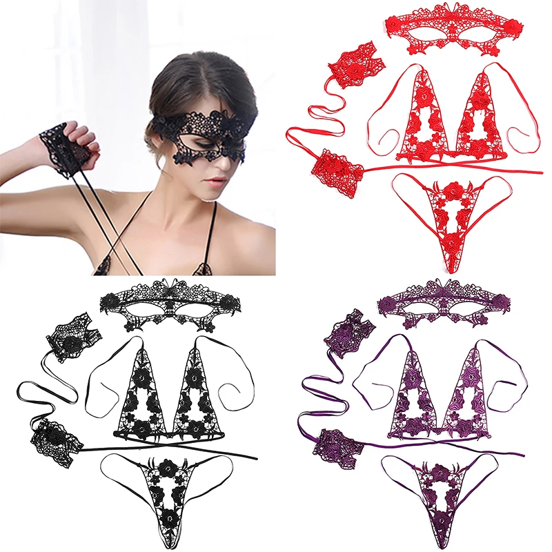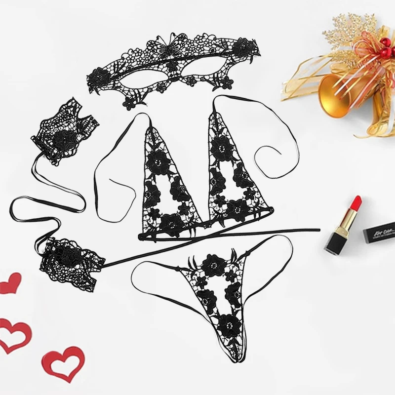 Комплект женского нижнего белья из 4 предметов, прозрачный кружевной бюстгальтер с маской и наручниками и трусики, размера плюс
