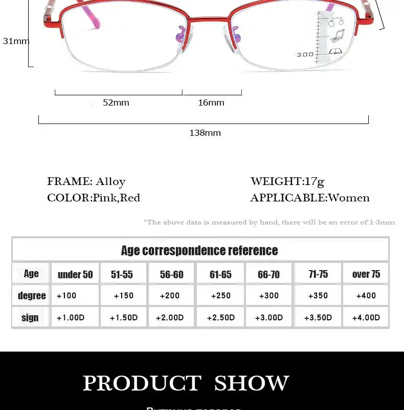 1. Это прогрессивные очки для чтения+ 100 означает: см. Дальность 0 градусов, см. Ближний + 100 градусов+ 150 означает: см. Дальность 0 градусов, см. Около + 150 градусов+ 200 означает: см. Дальность 0 градусов, см. Ближний + 200 градусов+ 250 означает: см. Дальность 0 градусов, см. Около + 250 градусов+ 300 означает: см. Дальность 0 градусов, см. Около + 300 градусов+ 350 означает: см. Дальность 0 градусов, см. Ближний + 350 градусов+ 400 означает: см. Дальность 0 градусов, см. Около + 400 градусов2. Дата очков одинаковая с обеих сторон. 3. В очках нет астигматизма. 4. Расстояние зрачка подходит для большинства пожилых людей. 5. При наблюдении с обеих сторон объектов, если вид для просмотра объектов из двух линз, вы можете найти эту четкость, уменьшенная. Это нормально, не волнуйтесь, вам просто нужно немного повернуть голову и попробовать посмотреть на центр объектива, и вы будете чувствовать себя очень ясно. 6. Обратите внимание, что начальное использование прогрессивных линз требует движения головы, но вы скоро сможете настроить его.7. При покупке более двух товаров предоставляется 5% дополнительной скидки, которая может сочетаться с другими скидками. Если вам нужно много товаров, свяжитесь со мной, и мы предоставим вам лучшую скидку.
