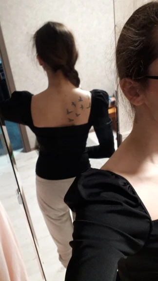 Спасибо за быструю доставку. Очень красивая кофта, в шоурумах такие же висят по 2000 рублей. Но размер S очень маленький (хотя я в жизни ношу ХS, параметры 86/58/86) берите лучше М. Натягивается очень трудно на тело, пачкается об тональник, об дезодорант, так что советую краситься уже после. При этом рукава фонарики очень свободные и приходится поправлять, чтоб не торчал лиф. Можно носить с прозрачными лямками, либо вообще снимать лямки от лифа. Декольте очень хорошо подчёркивает! В общем на выход/фотосессию - советую! Но не для носки, так как синтетика и не очень удобно