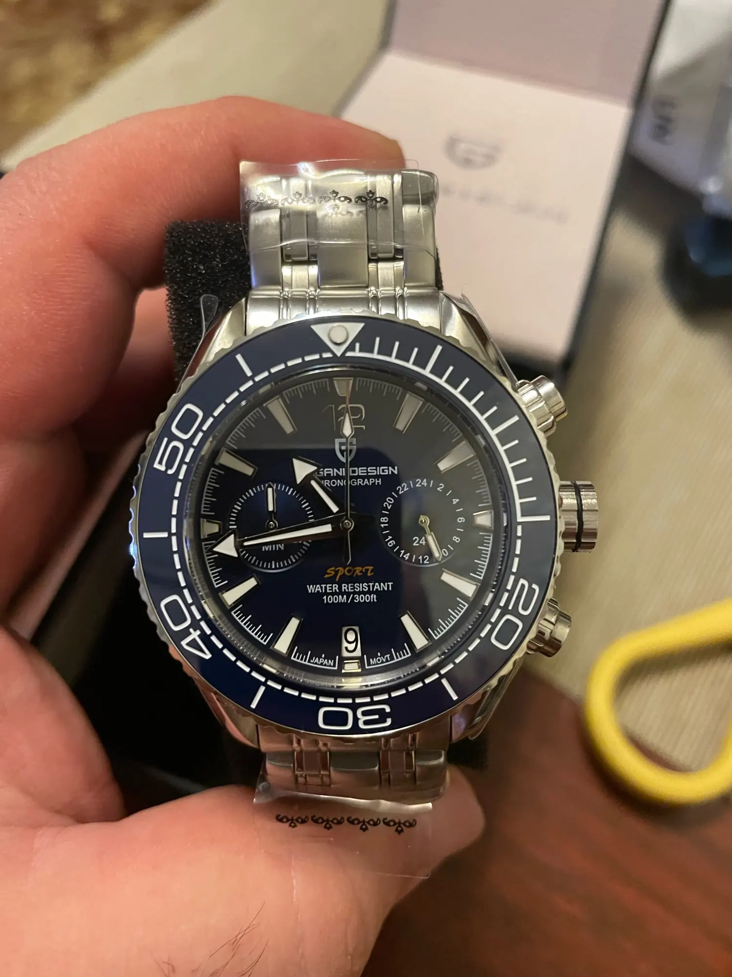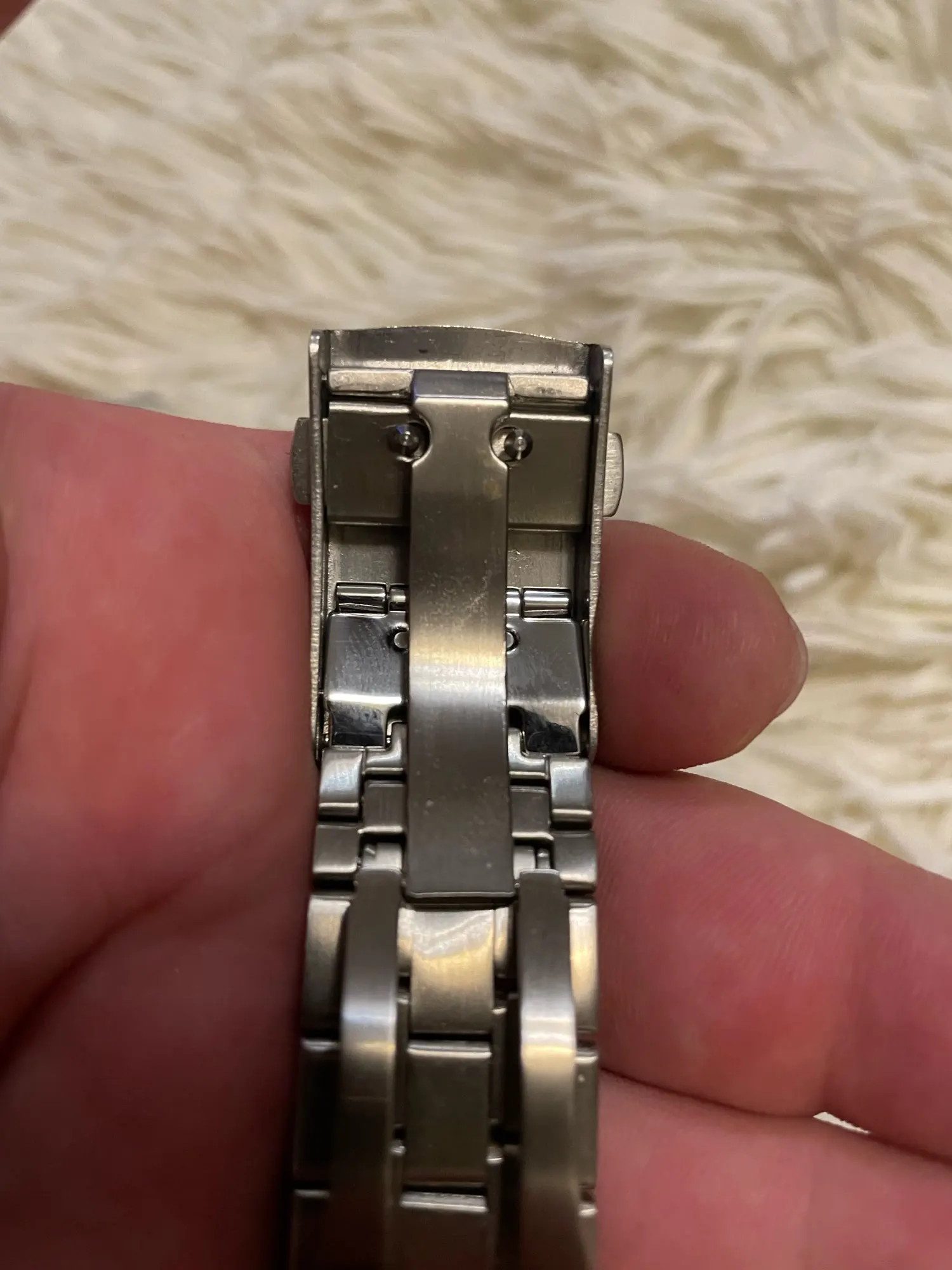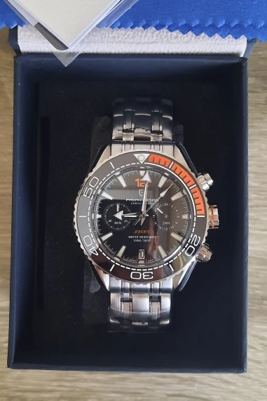 Внешний вид хороший, часы увесистые, сидят на руке хорошо. Но, есть нюансы. Чтобы выставить число нужно крутить среднюю крутилку, отдельно число не выставляется. Но когда крутишь крутилку сильно бросается в глаза что шток у крутилки кривой. И немного вызывает сомнение сам браслет, точнее его механизм - застежка. Он как будто заедает и при застёгивание и расстёгивание. Посмотрим как будет при носке.