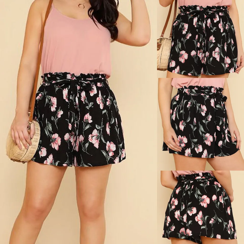 Шорты женские, эластичные, с высокой талией, с цветочным принтом, широкие, 30H, размера плюс