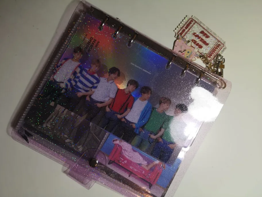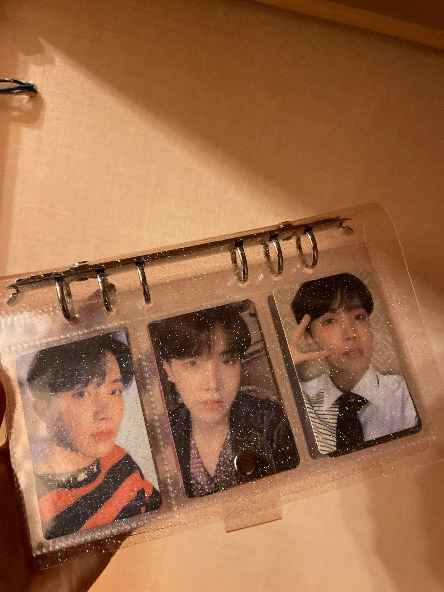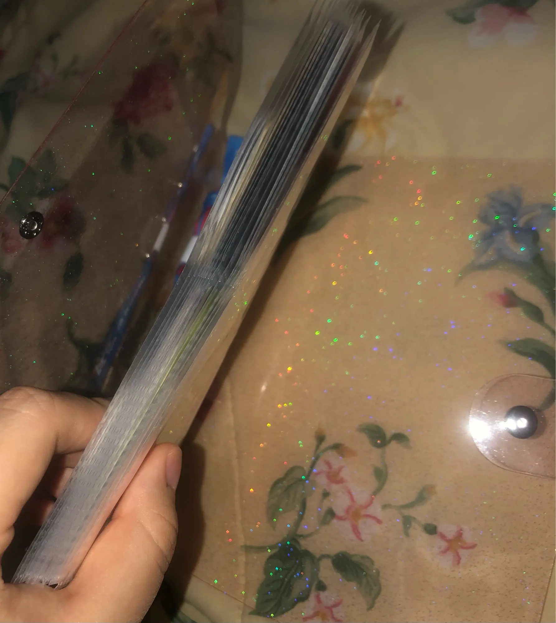 Просто прекрасный картхолдер, очень красивый, блестки явно придают некий шарм. Пахнет резиной, но это максимум на день-два, вы должны это понимать. В папке уже шло 5 файлов. Отлично подходит для кпоп карт стандартного размера. До России (волгоградской области) дошёл за 6 дней, я очень приятно удивлена. Рекомендую товар к покупке, но лучше дополнительно купите файлики)