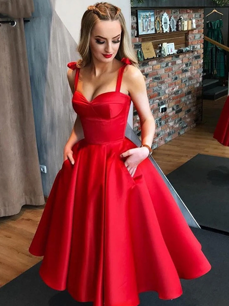 Вечернее атласное платье-трапеция, на тонких бретелях, красное