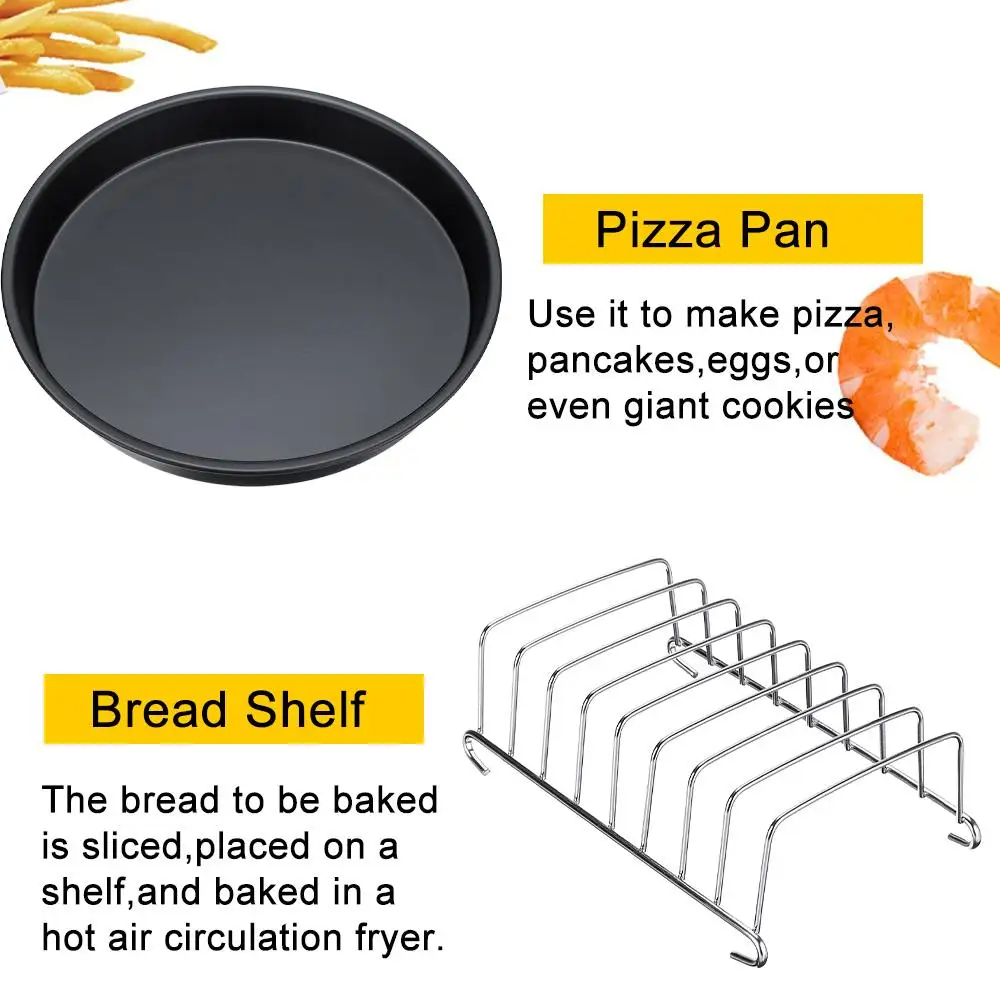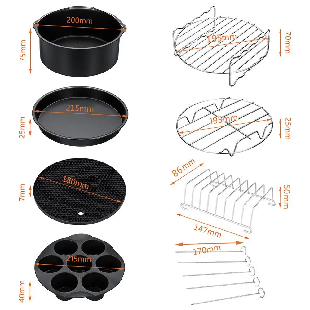 Особенности:-Простота в использовании и безопасность/высокое качество и долговечность/Приготовление пищи становится более удобным и эффективным!-Бочонок для торта: Сделайте здесь вкусный торт, удобство и легкость маневренности.-Сковорода для пиццы: приготовьте пиццу, яйца, блинчики и печенье, которое вам нравится.-Силиконовый коврик: предоставьте вам термостойкую поверхность, чтобы разместить ваши горячие аксессуары.-Металлический держатель: Позвольте второму слою пищи, максимизируя поверхность для приготовления пищи.-Шашлык: Подставка для овощей и мяса shish kabobs.-Хлебная скорлупа: хлеб, который нужно запечать, нарезается, помещается на полке, и запечен в жаркой циркуляции воздуха фритюрница.-Чашка для торта: вы можете испечь сразу 7 мини-тортов с воздушной фритюрницей.
