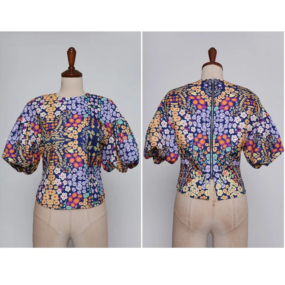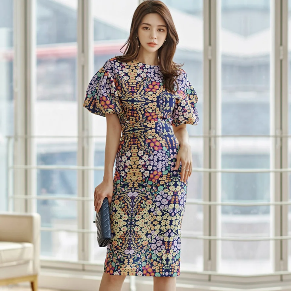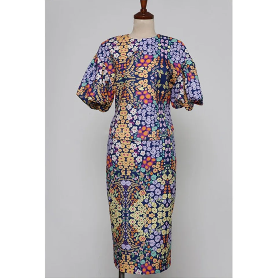 Женский офисный костюм-двойка, элегантный облегающий топ с рукавами-фонариками и цветочной юбкой на бедрах, лето деловой костюм с юбкой, 2020