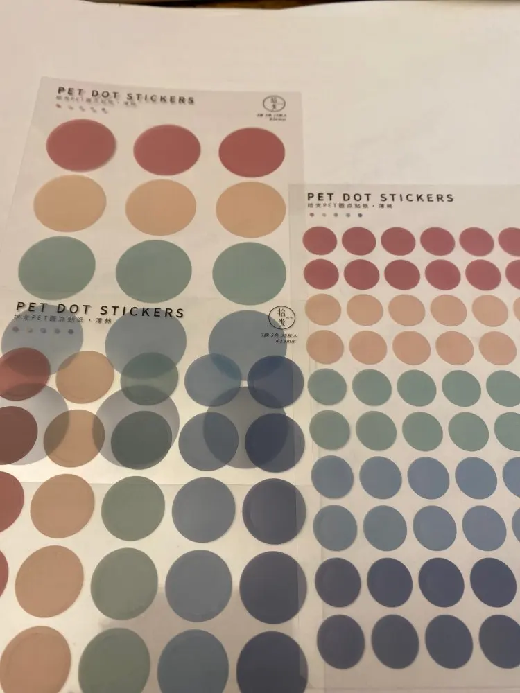 Они очень милые, они точно такие же, как на фото. Я люблю их и то, что они поставляются в разных размерах. Они тоже хорошо прилипают. Только подумайте о них, что я получил назад, это то, что они прозрачные наклейки, поэтому, если вы положите их поверх бумаги на подкладке, вы увидите линии внизу, но все равно отличный продукт.