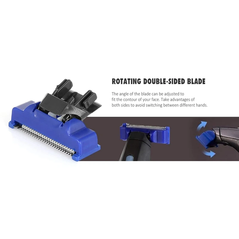 Ржавчина, может быть очищена водойВращающееся двухстороннее лезвие для регулировки угла и установки контура лицаОткрытый тип задней сетки, легко разрядить остаточные волосыБез вреда для кожи с круглыми зубцами лезвияМатериал: металл + пластикЦвет: синий + черный + серебристыйПосылка в комплект входит:1 * Сменные головки для бритвыТолько вышеуказанная посылка, другие товары не включены.Примечание: светильник и различные дисплеи могут привести к тому, что цвет товара на картинке немного отличается от реального. Допускается погрешность в измерениях +/- 1-3 см.