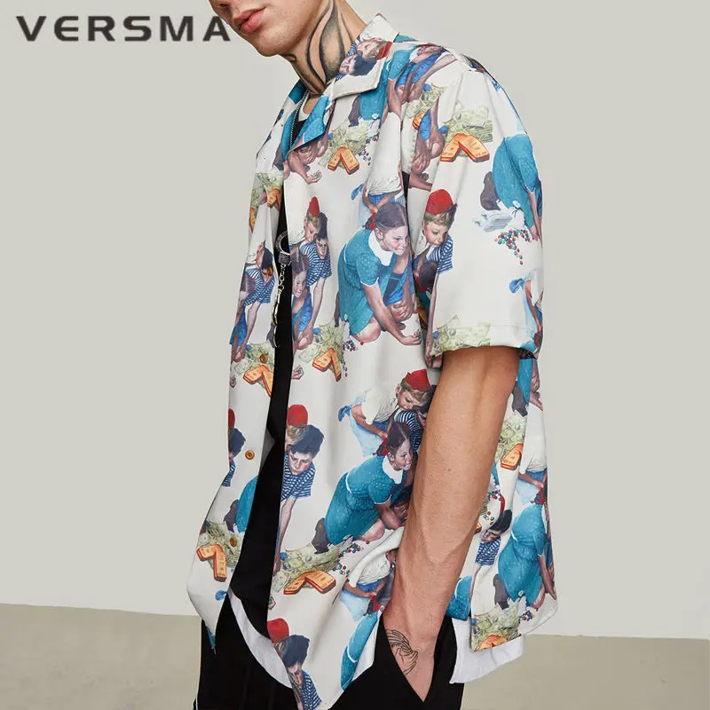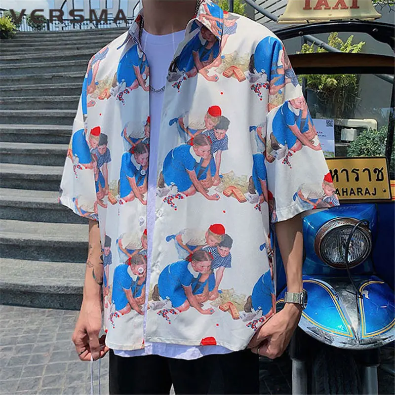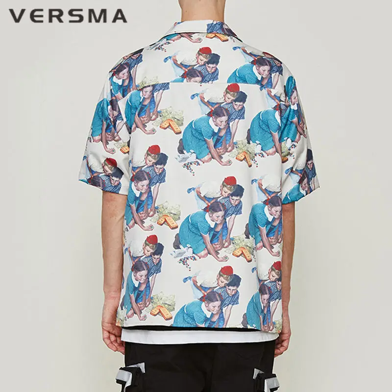 VERSMA в Корейском стиле Harajuku с изображением котенка; Футболка с коротким рукавом Для мужчин летний свободный зеленый Винтаж Гавайская тропическая рубашки Для мужчин дропшиппинг