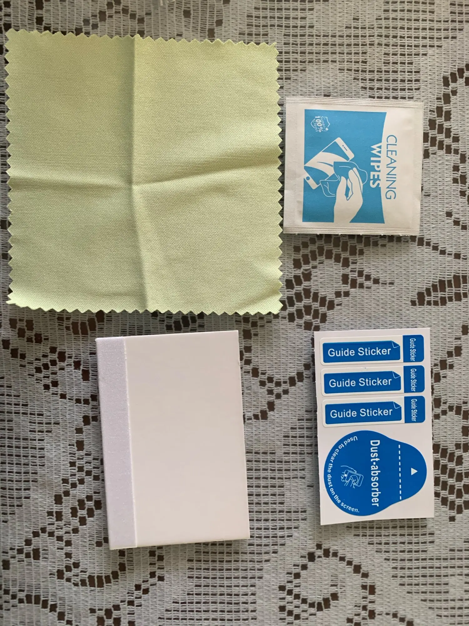 Отличный товар продавца включает в себя салфетку, ткань из микрофибры и карту для выдавливания пузырьков. Защитная пленка очень хорошо сидит!