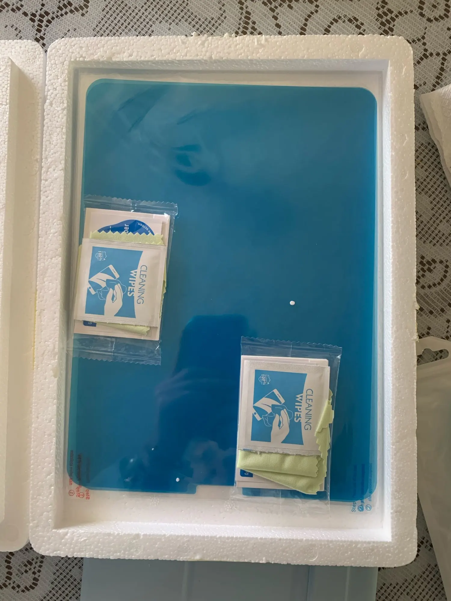 Доставляется в броне из пенопласта. В комплекте есть мягкий шпатель для сгонки воздуха, спиртовая салфетка, оставляющая огромное количество разводов, после которой надо заново чистить экран. Салфетка фибра которая рассыпается в труху и не может очистить экран после спиртовой салфетки, оставляя желтые мелкие частички на экране :D В общем протирать надо чем то другим, если пыль попадет под плетку, можно снять ее наклейкой из комплекта. Раза с третьего приклеилась ровно, пузырей нету. На ощупь приятно, рука скользит как по бумаге. Экран теперь матовый и меньше загрязняется. Супер!
