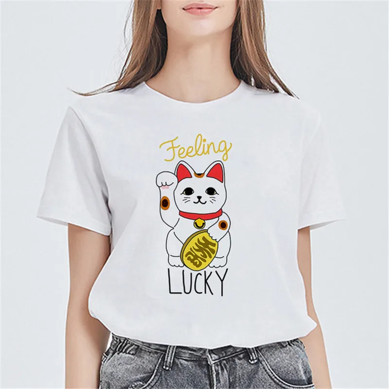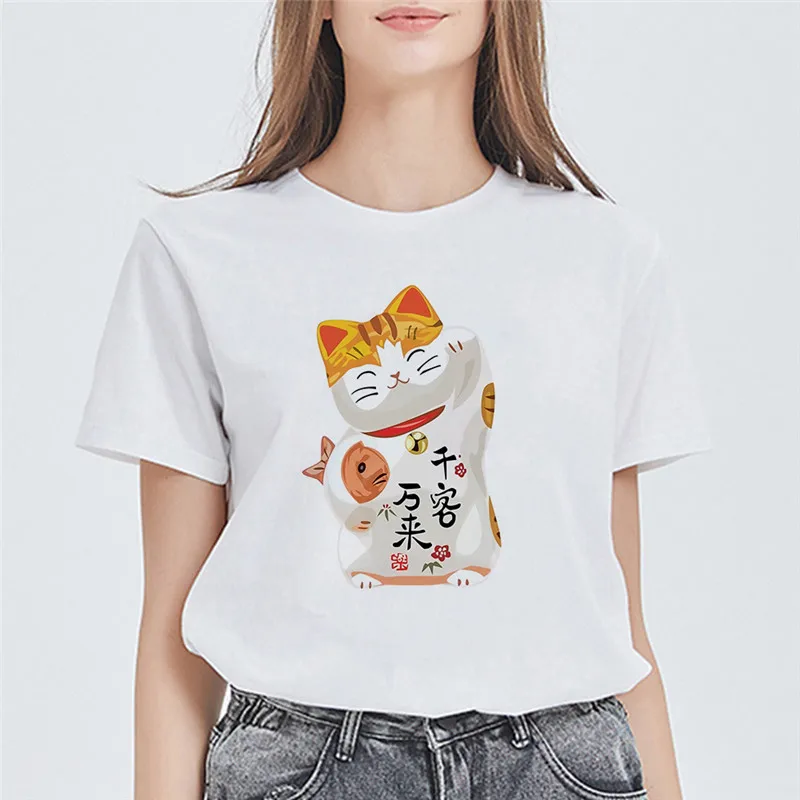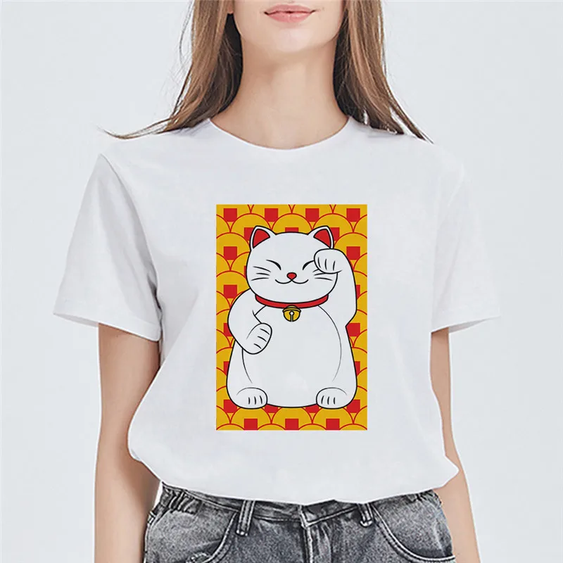 Женские футболки с принтом LUSLOS Maneki Neko, летние футболки с рисунком кота удачи в стиле Харадзюку, женские Т-образные Топы уличная одежда, женская одежда