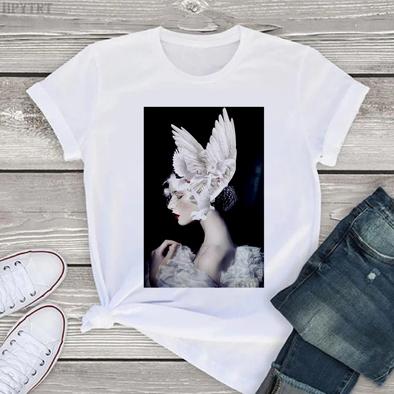 Harajuku Art Футболка с принтом перьев летняя модная женская футболка с коротким рукавом повседневные топы с 0 воротником белая футболка женская одежда