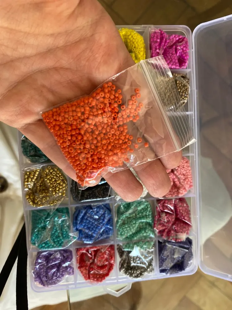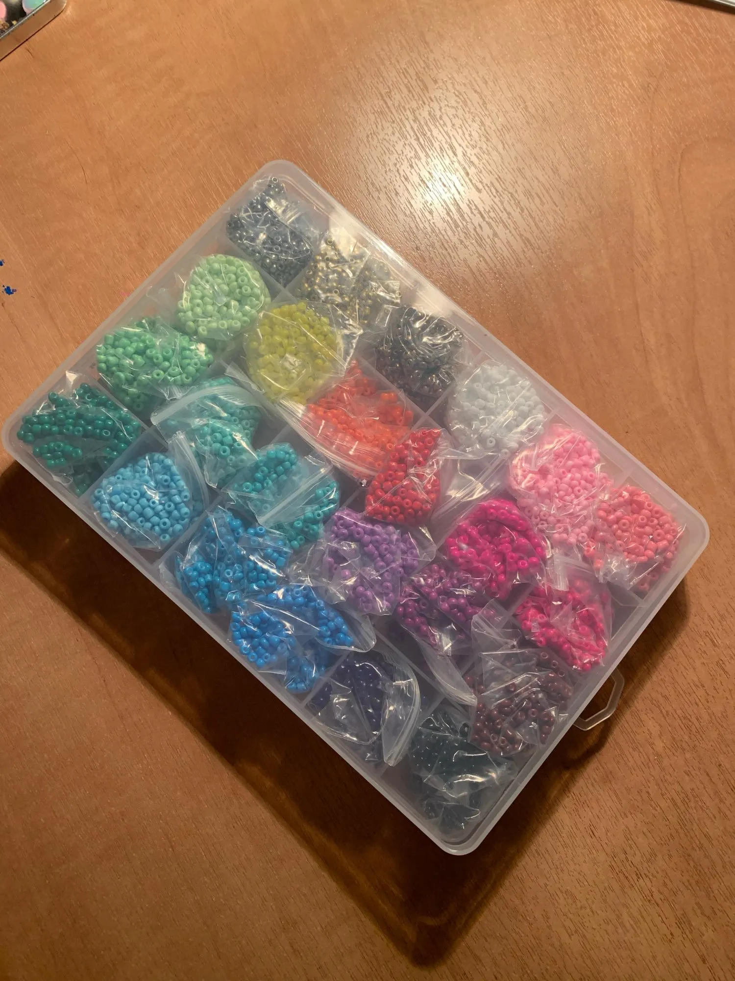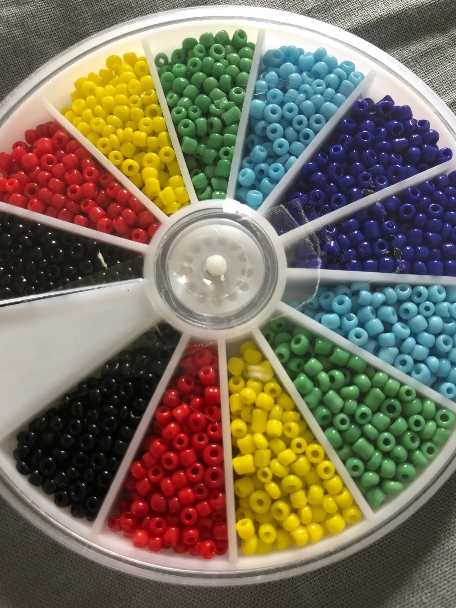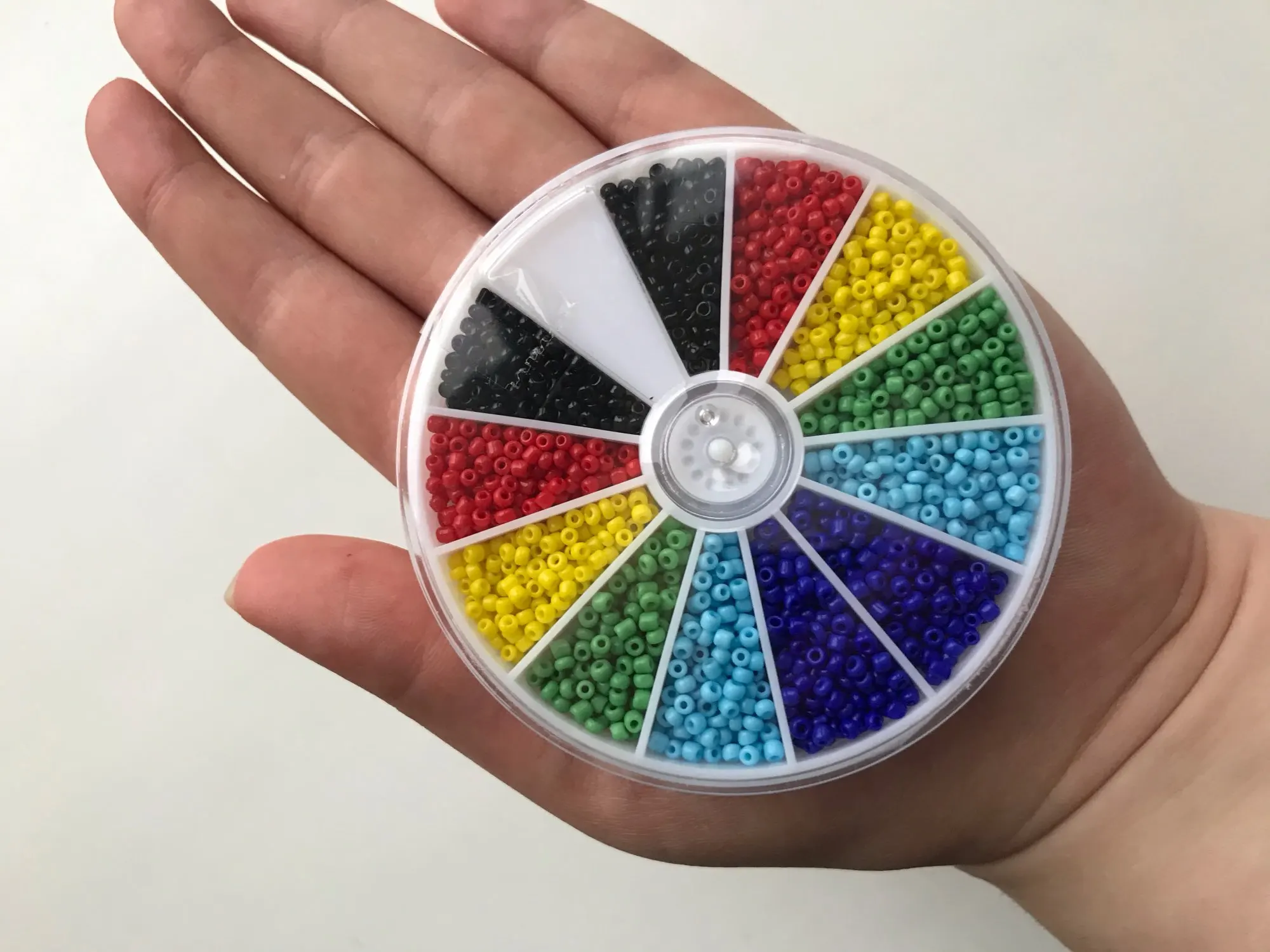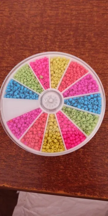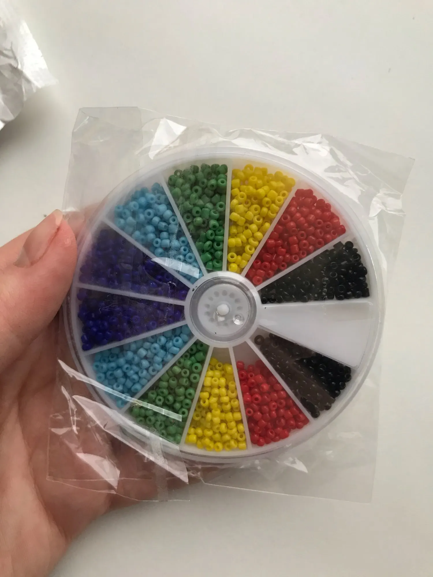 Цвет не совпадает с картинкой. Только зелёный и жёлтый схожи. Тёмный фиолетовый вообще не такой, а голубой синий. Контейнер слабый, думаю, сломается очень быстро. Форма бисера как у обычного китайского, каждый уникален.