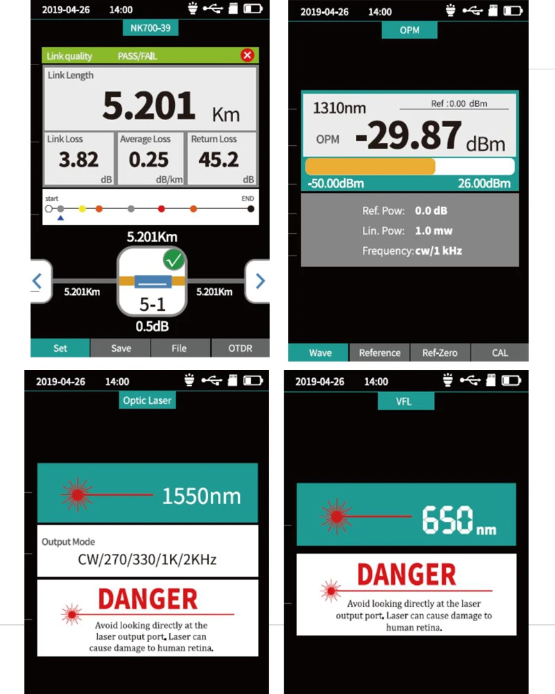 Диапазон тестирования: от 3 м до 64 км 9 функций в 1 устройстве 1) OTDR 2) карта событий 3) оптический источник светильник 4) оптический измеритель мощности 5) Визуальный дефектоскоп 6) последовательность кабелей Ethernet RJ45 7) Расстояние между кабелями Ethernet 8) трекер кабеля Ethernet(Дополнительный детектор покупки) 9 светодиодный светильник