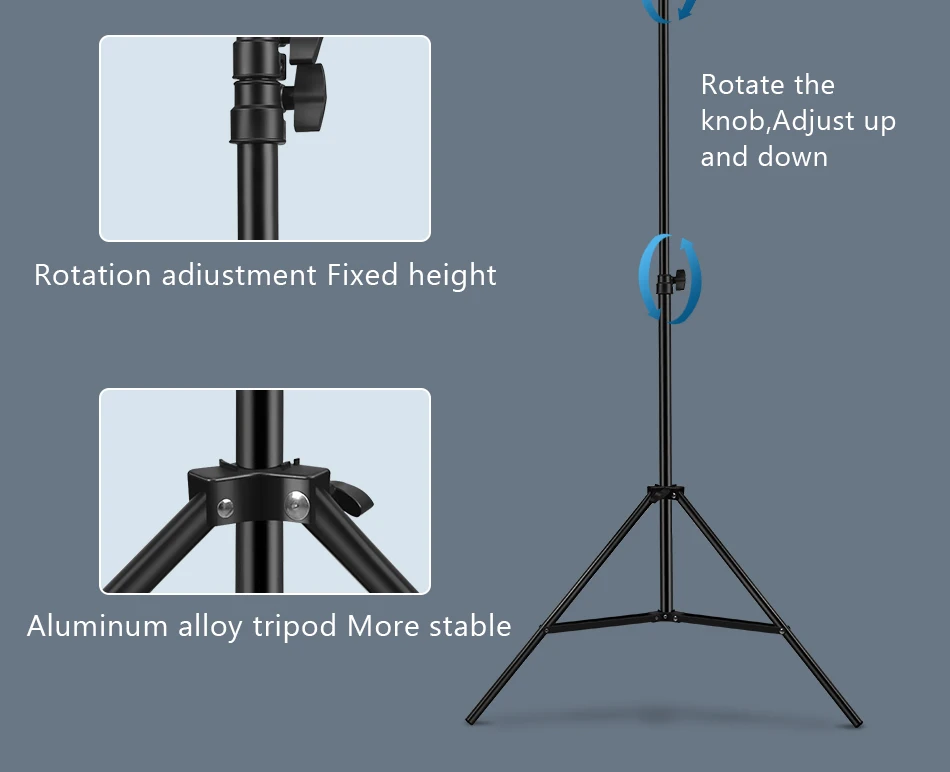 очень понравился штатив и лампа. хорошее качество. брала высотой 210, даже на полную высоту с телефоном все хорошо держится. светит лампа хорошо. единственное небольшое неудобство в том что работает только от провода. а так заказом очень довольна. пришло все быстро.