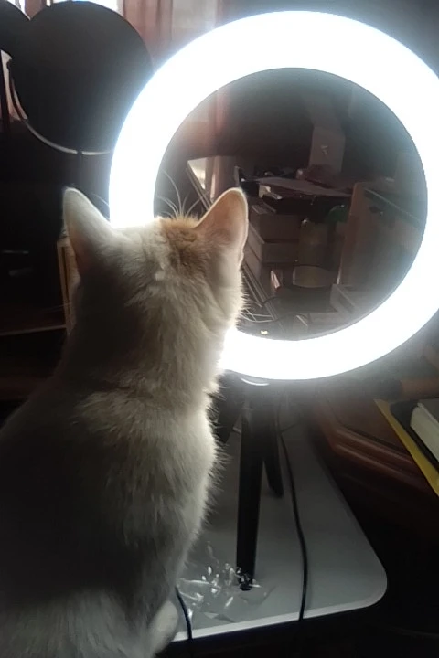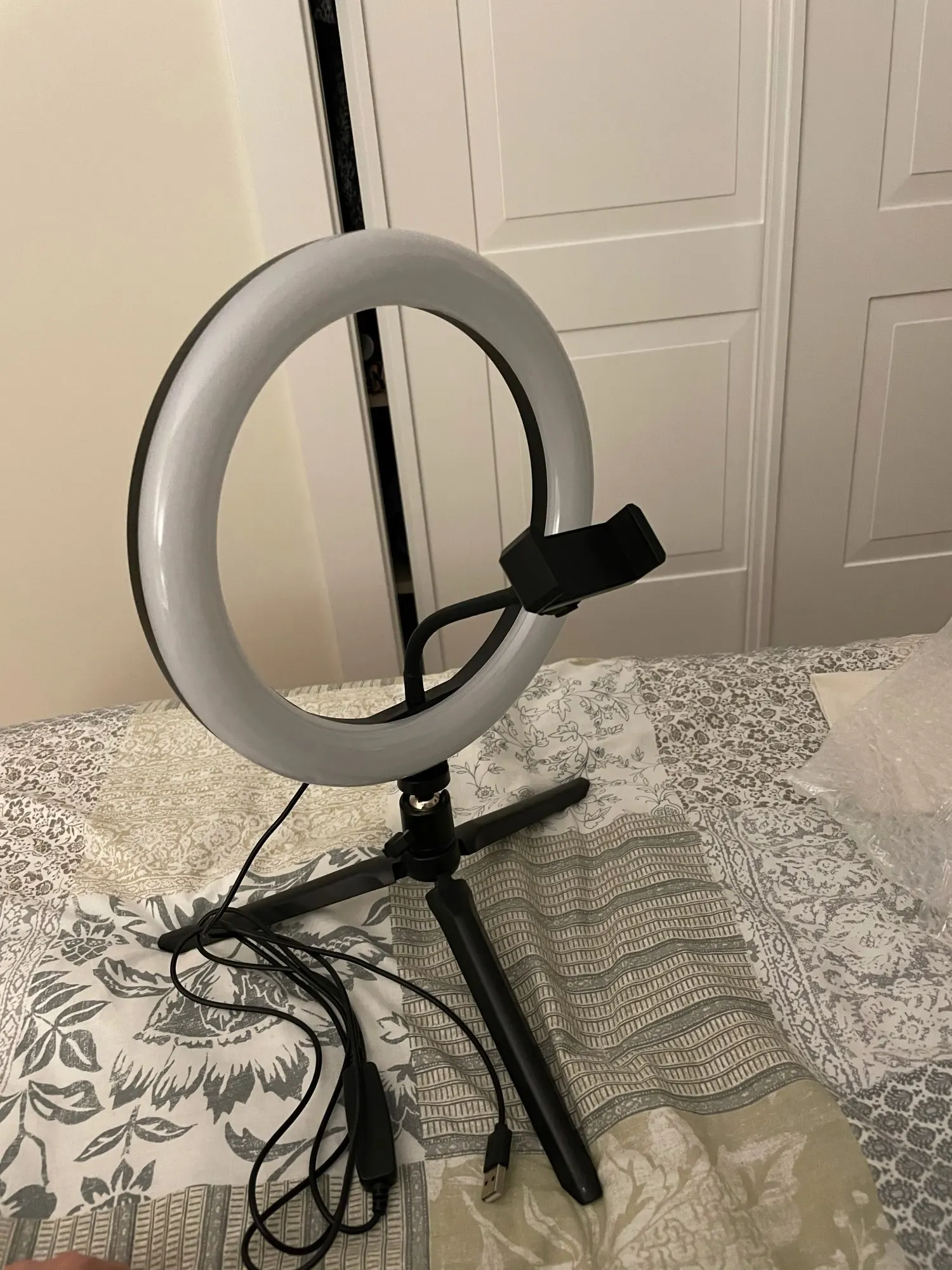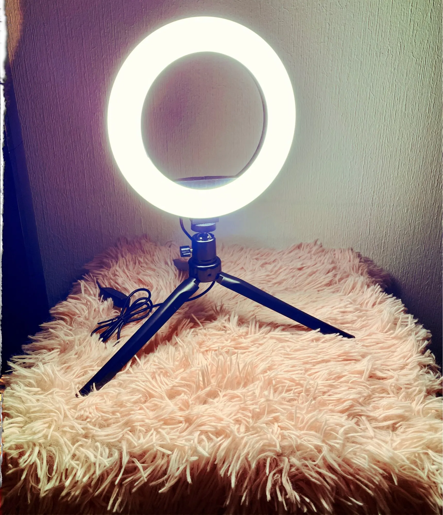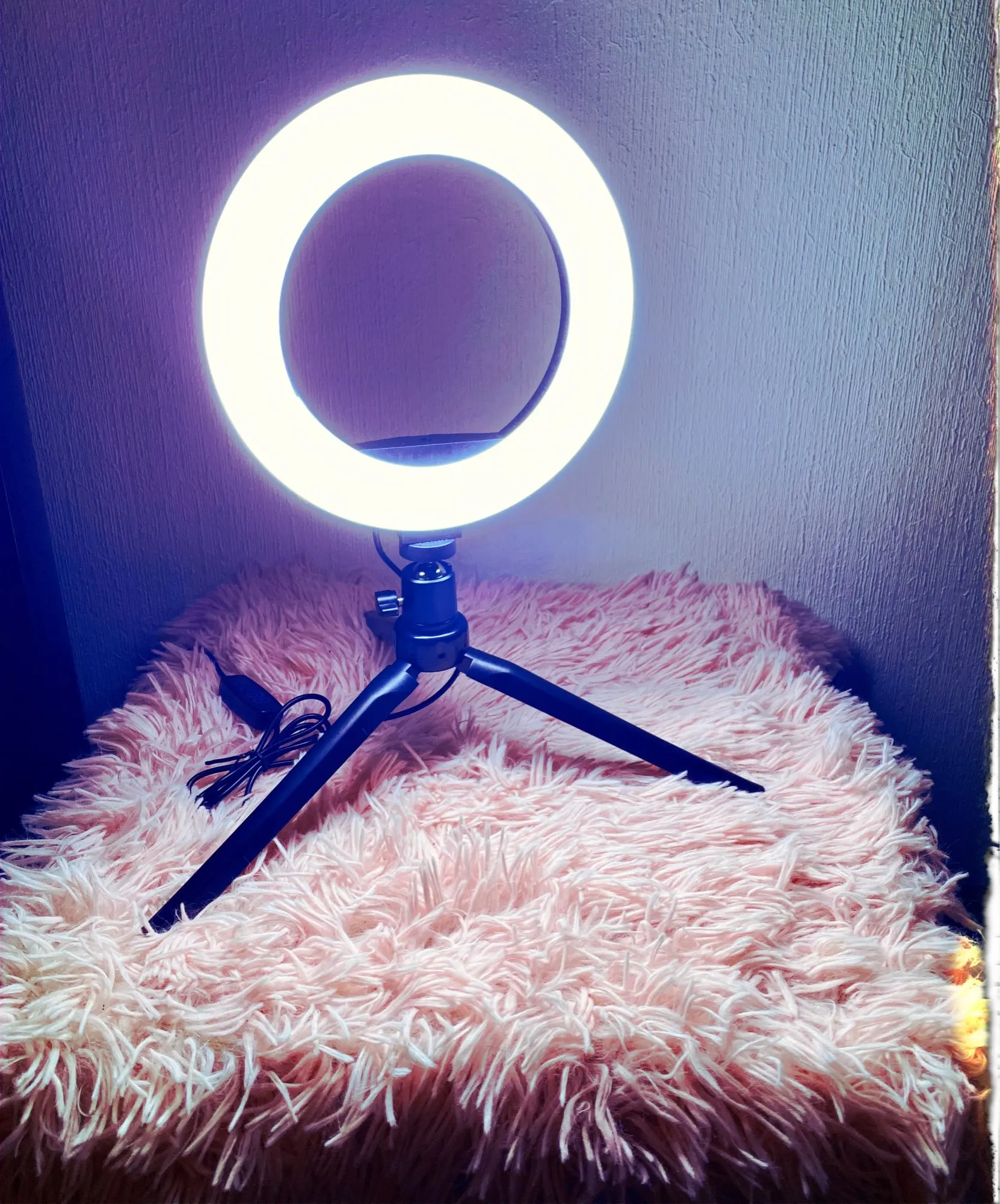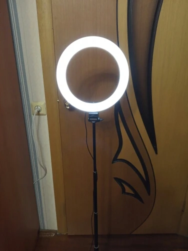 классная лампа, жутко нравится. свет можно сделать голубой, желтый, белый + регулируется яркость. штатив хороший. с телефона снимать не пробовала, не для него покупалось. вилки правда нет, а жаль, всё только usb провод. доставка 10 дней прямо до квартиры.