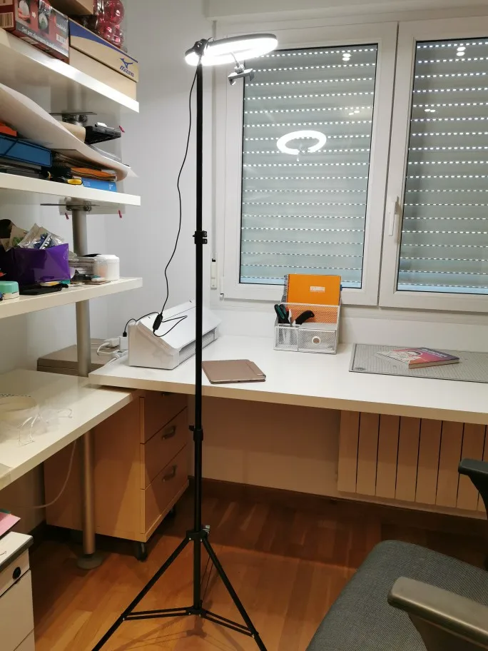 Превосходная лампа! Я действительно доволен. Одна только лампа очень практична благодаря 3 режимам (нормальные, теплые цвета и холодные цвета), но также может варьироваться в зависимости от яркости. Кроме того, система вращения позволяет легко выбрать ориентацию последней части стопы. Стопа большая в разложенном виде (1m60), а также довольно компактна при хранении и сложенном виде. Я был приятно удивлен, обнаружив зажим для телефона, чтобы добавить, если необходимо, на лампе.