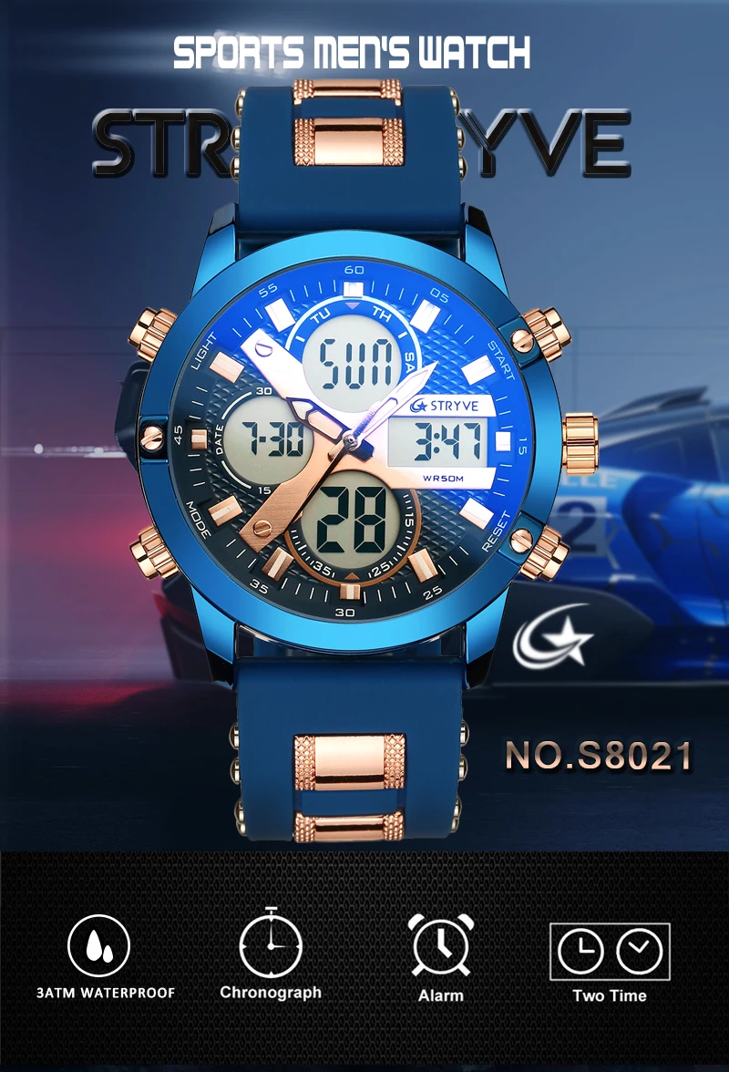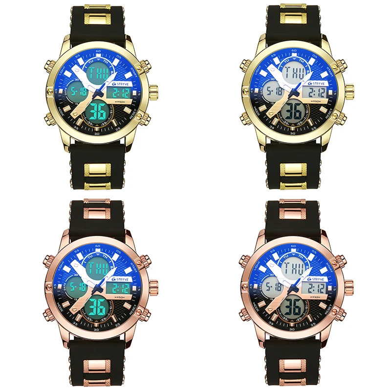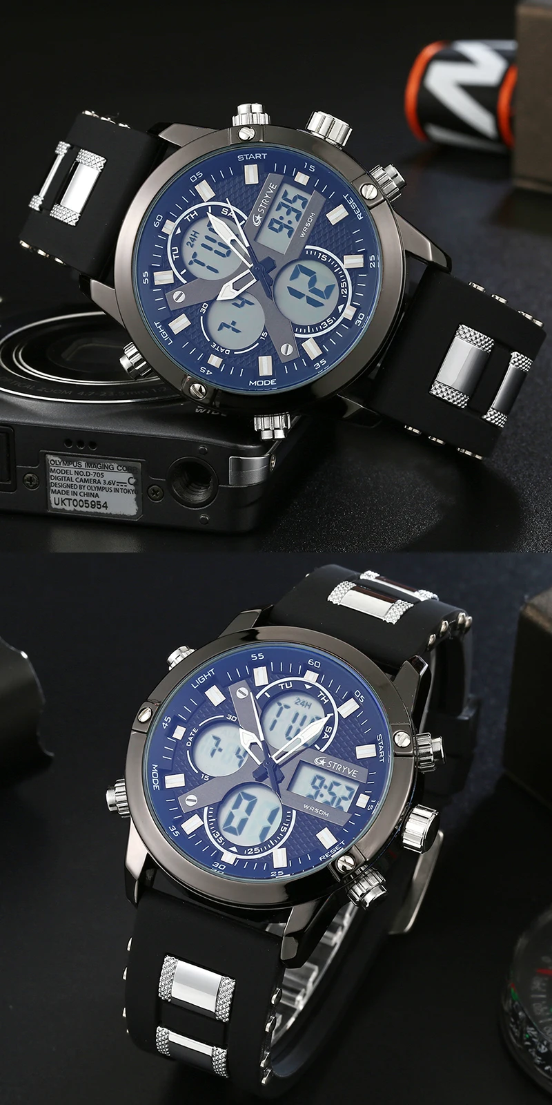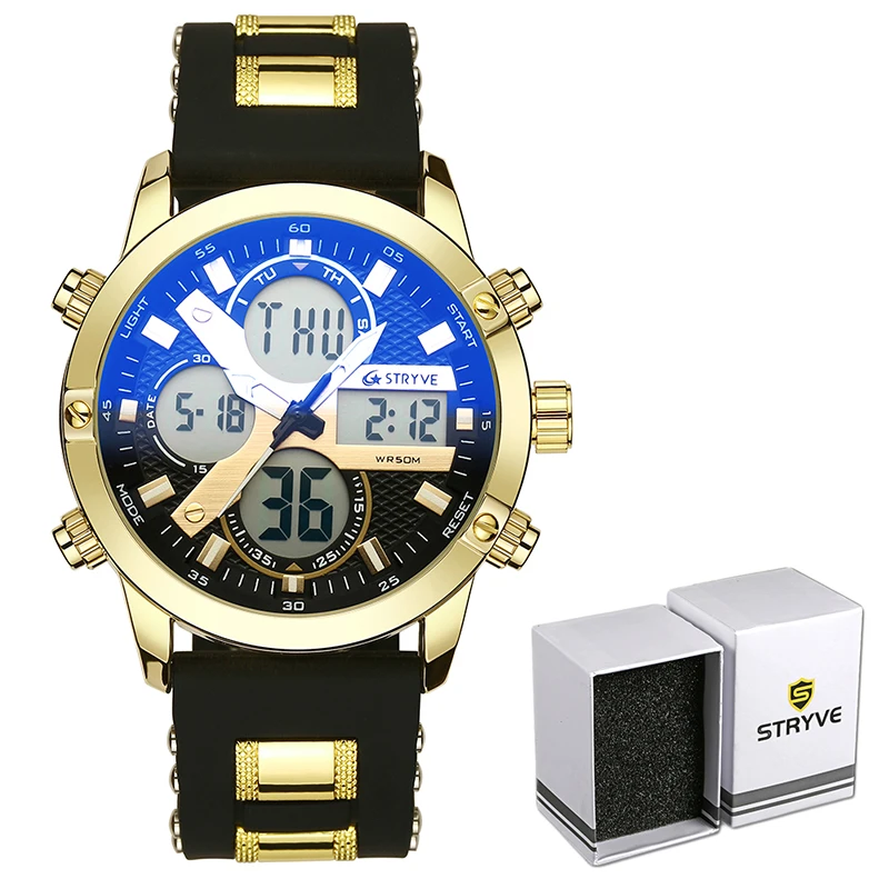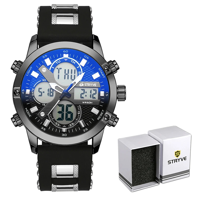 STRYVE 8021 новые спортивные мужские часы, военные часы с датой недели, электронные мужские часы, водонепроницаемые Роскошные Цифровые кварцевые часы с двойным временем