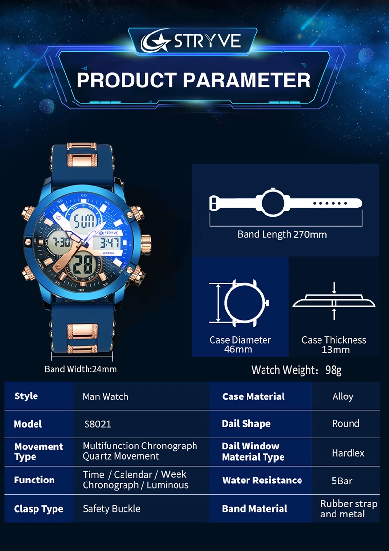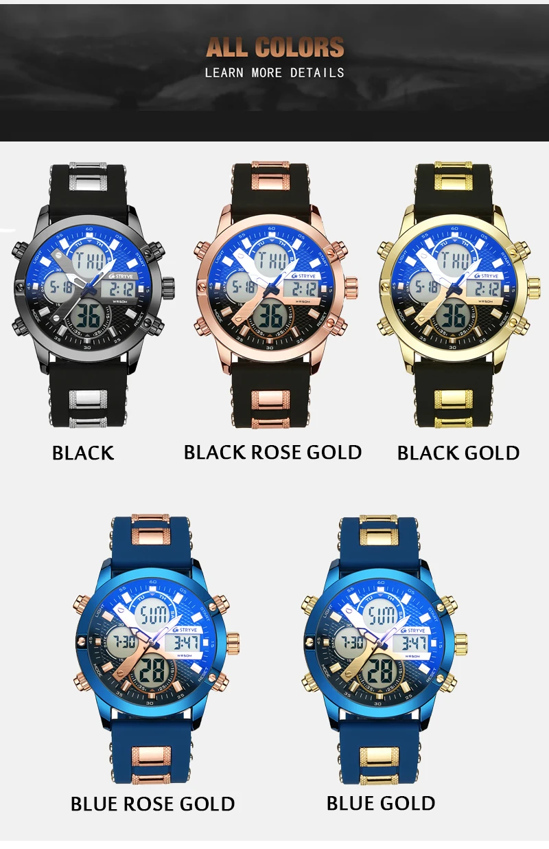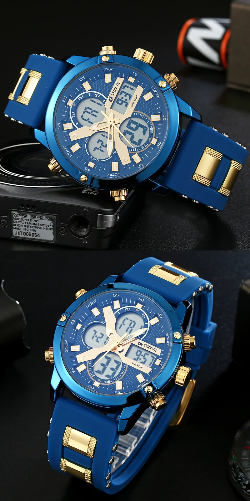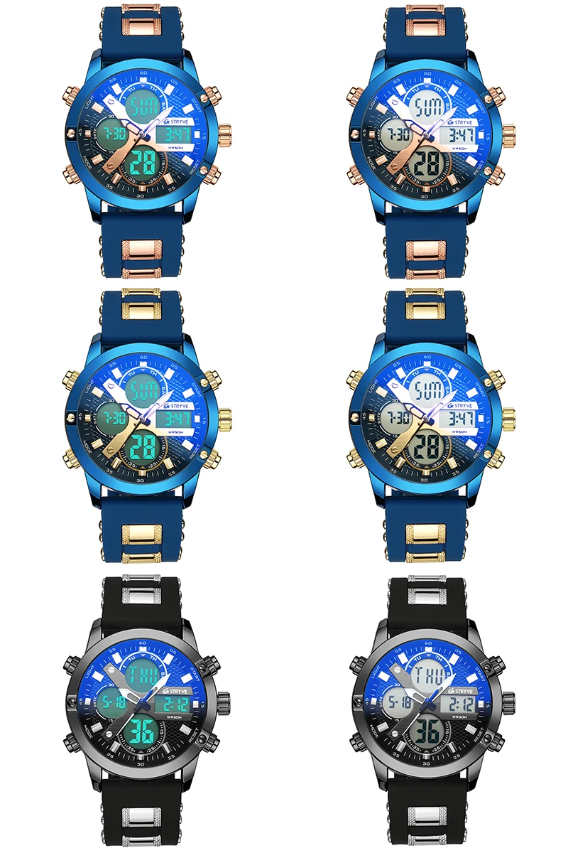 STRYVE 8021 новые спортивные мужские часы, военные часы с датой недели, электронные мужские часы, водонепроницаемые Роскошные Цифровые кварцевые часы с двойным временем