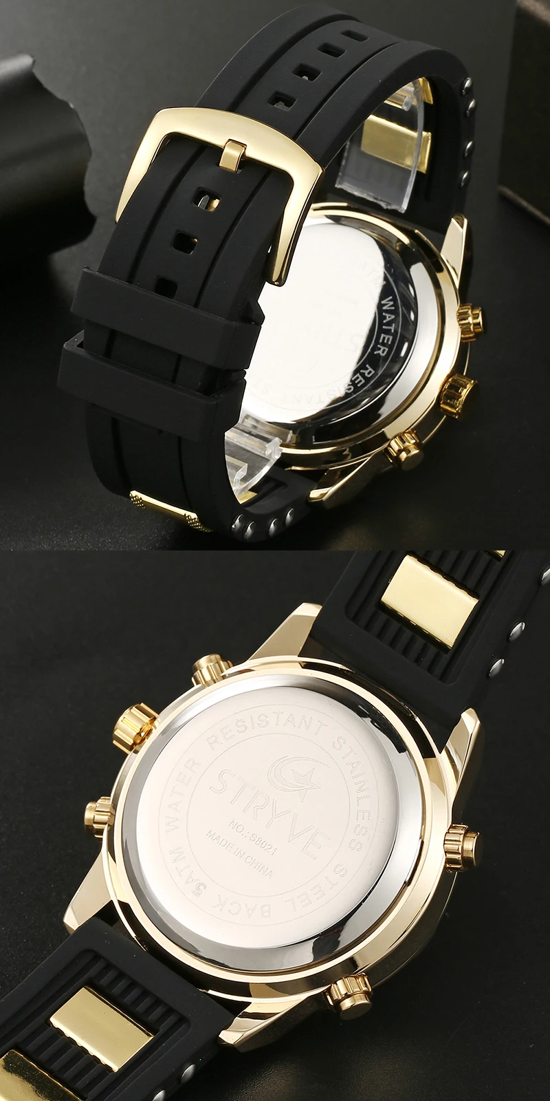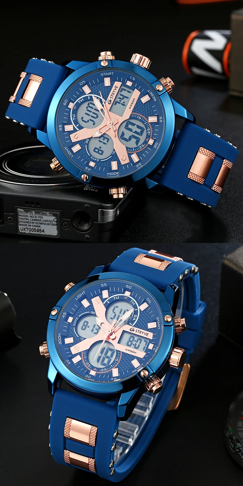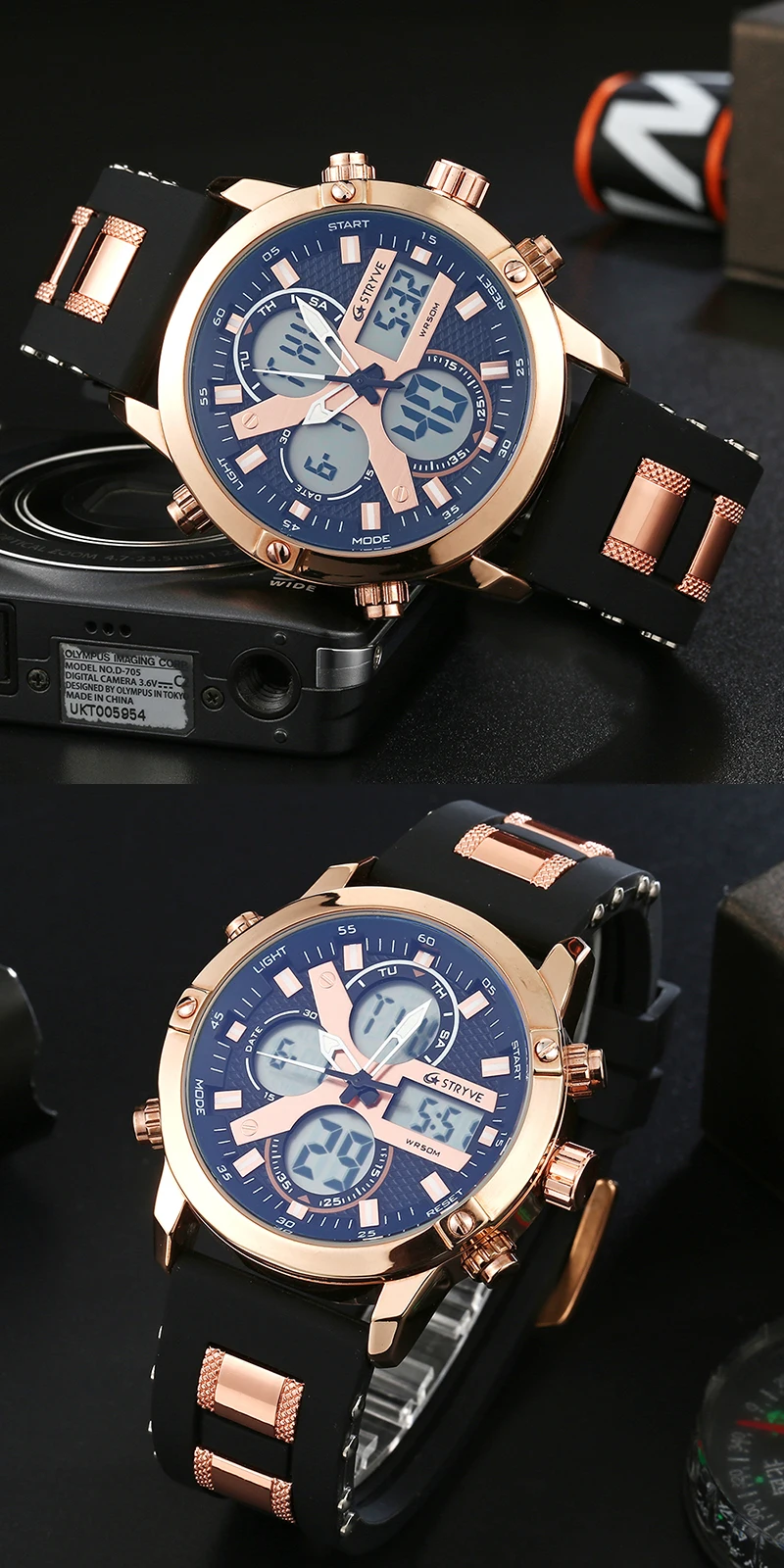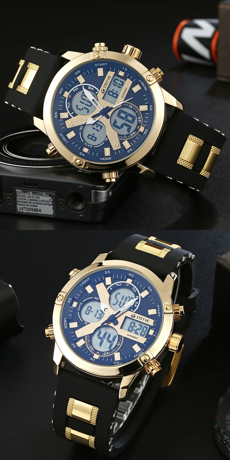 STRYVE 8021 новые спортивные мужские часы, военные часы с датой недели, электронные мужские часы, водонепроницаемые Роскошные Цифровые кварцевые часы с двойным временем