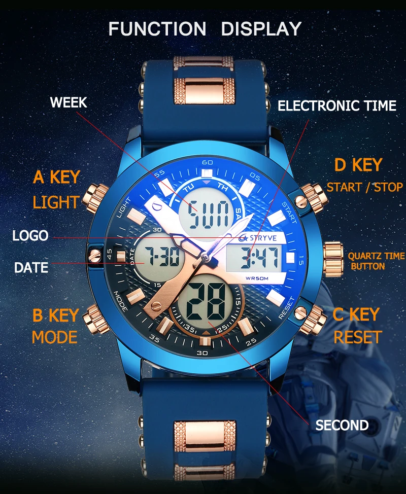 STRYVE цифровые спортивные часы, многофункциональный светодиодный, водонепроницаемый, 50 м