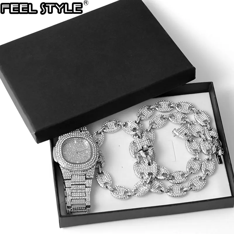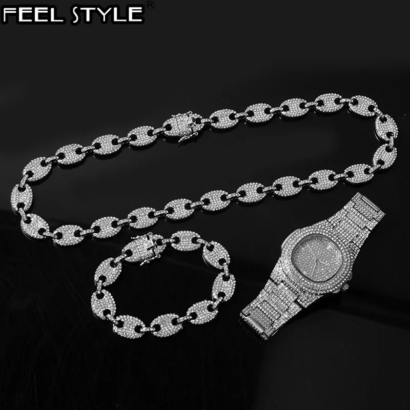 Часы + цепочка + браслет в стиле хип-хоп, кофейное ожерелье со льдо...