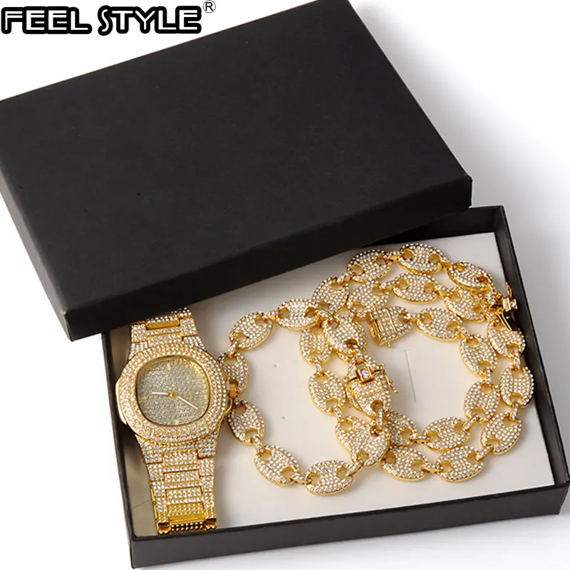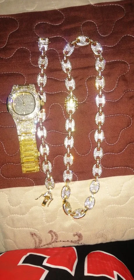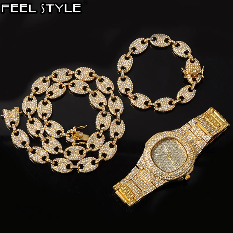 Часы + цепочка + браслет в стиле хип-хоп, кофейное ожерелье со льдо...