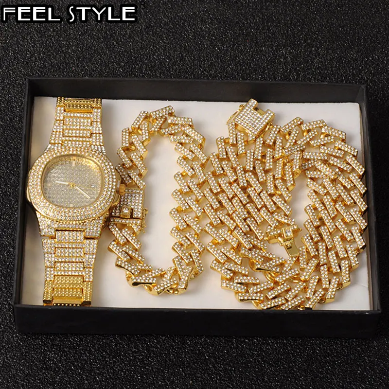 Часы + цепочка + браслет в стиле хип-хоп, украшенные кристаллами со льдом 15 мм, кубинские стразы, Miami Zircon, мужские ожерелья для мужчин, ювелирные изделия