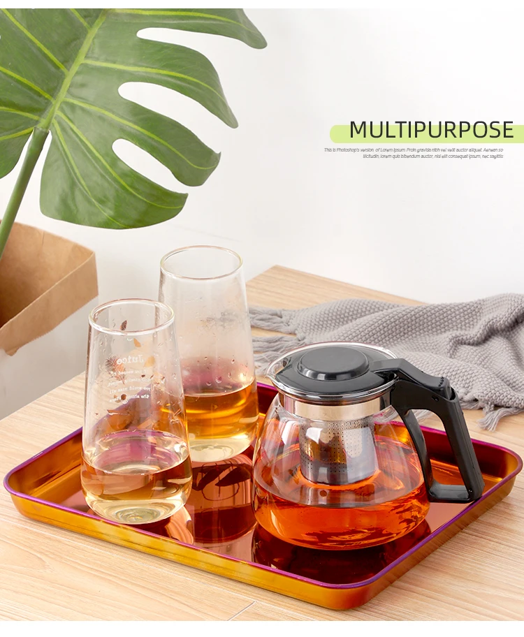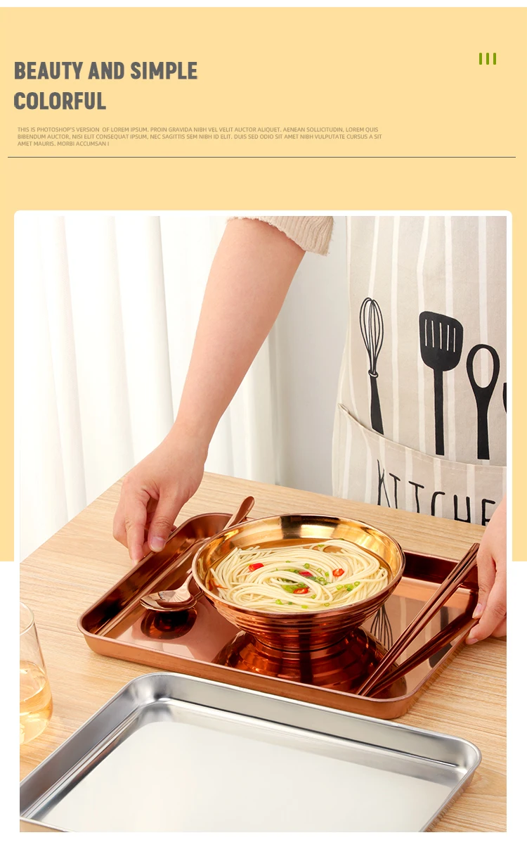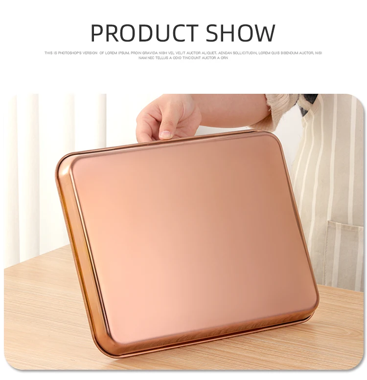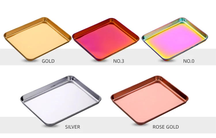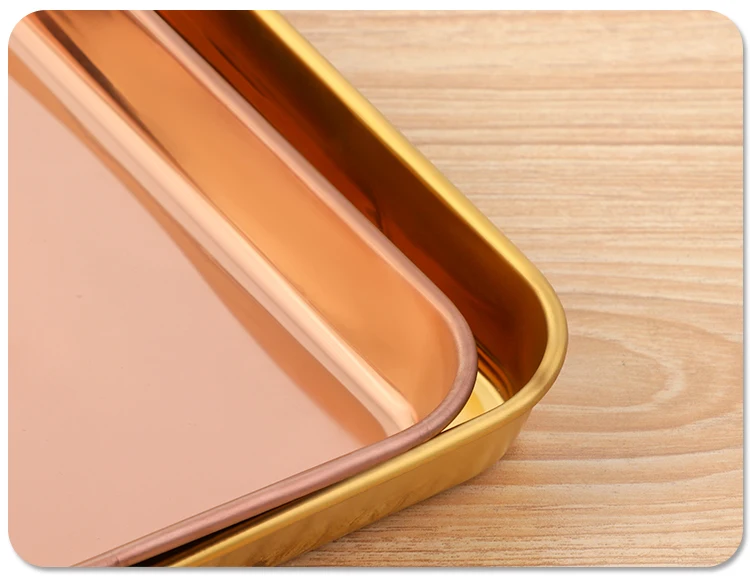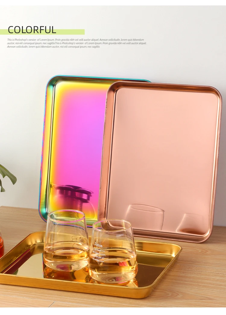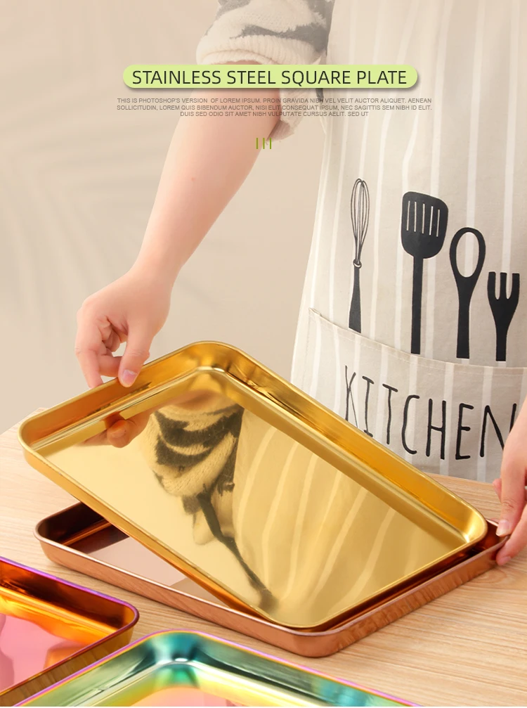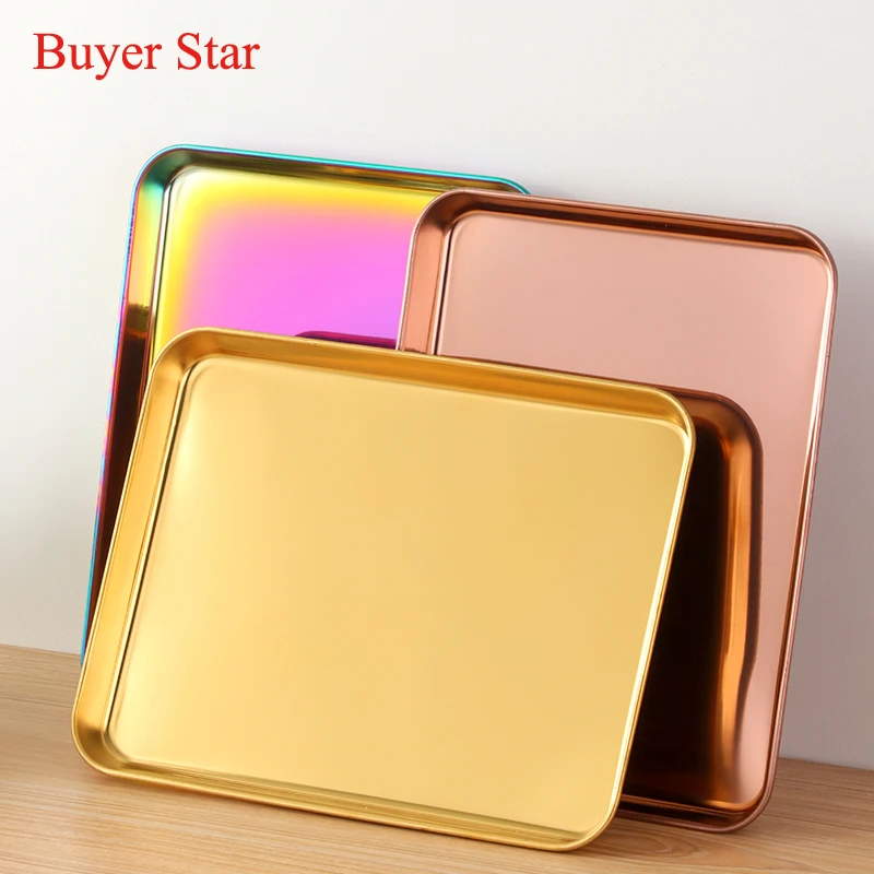 Особенности-Цвет: серебристый, золотой, розовое золото, Радуга № 0/3-Материал: нержавеющая сталь 430.-Размер: 31.3x24.5X2.5cm-Изготовлен из качественной нержавеющей стали без любого другого материала или покрытия, безопасный и прочный.-Супер зеркальная отделка всегда остается сияющей и легкой для выпуска пищи, гладкие края и без оправы дизайн не будет покрывать dishwater и приемных микробов.-Гладкая кромка рулона, без шероховатого пятна, превосходное зеркальное покрытие, легко чистится.-Идеально подходит для еды, фруктов и овощей и т. Д.Комплектация: 1 поднос из нержавеющей стали