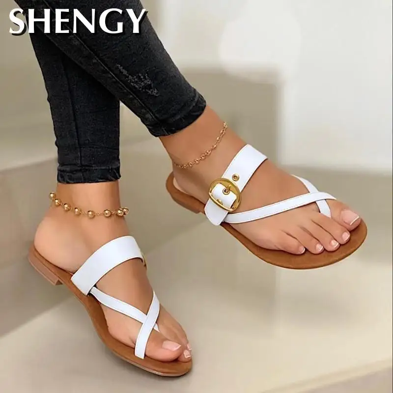 2020 женские летние шлепанцы, модные шлепанцы с пряжкой, однотонная женская обувь, повседневная Пляжная женская обувь на плоской подошве, размера плюс