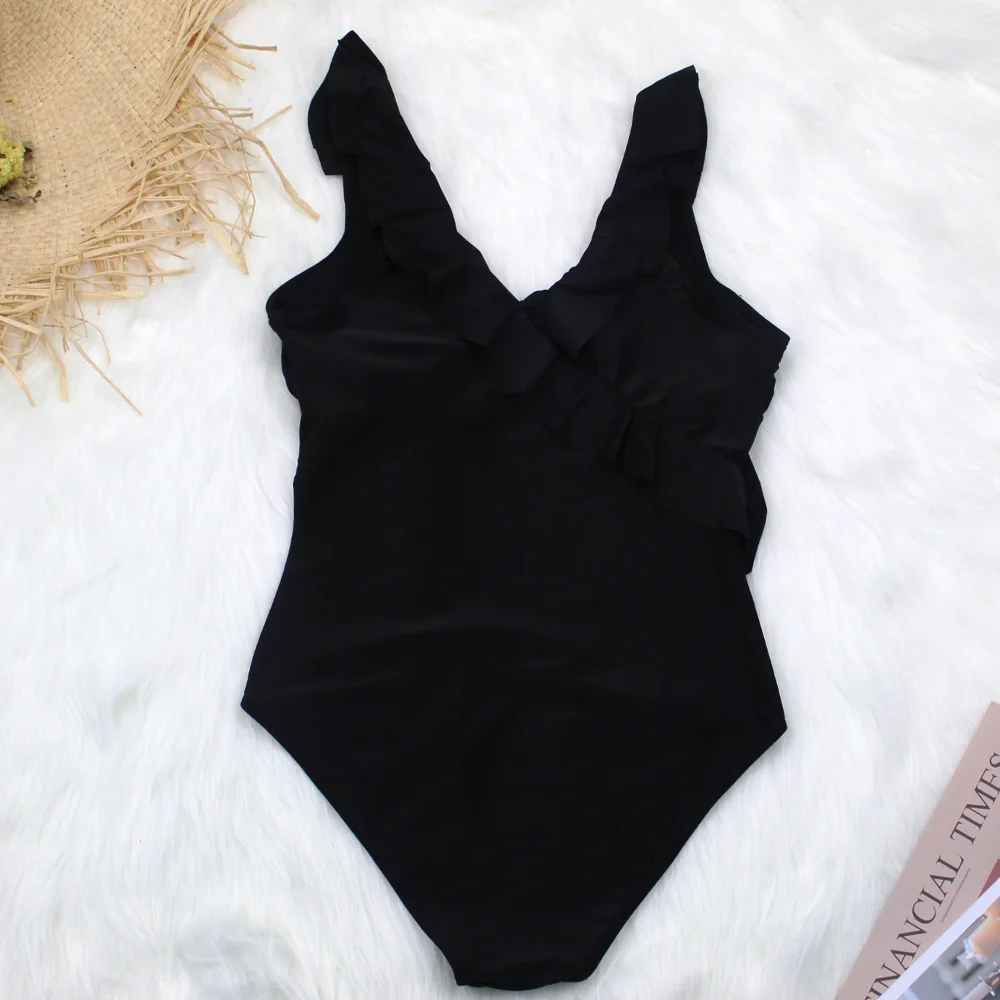 Женский слитный купальник с оборками и глубоким вырезом, черный куп...