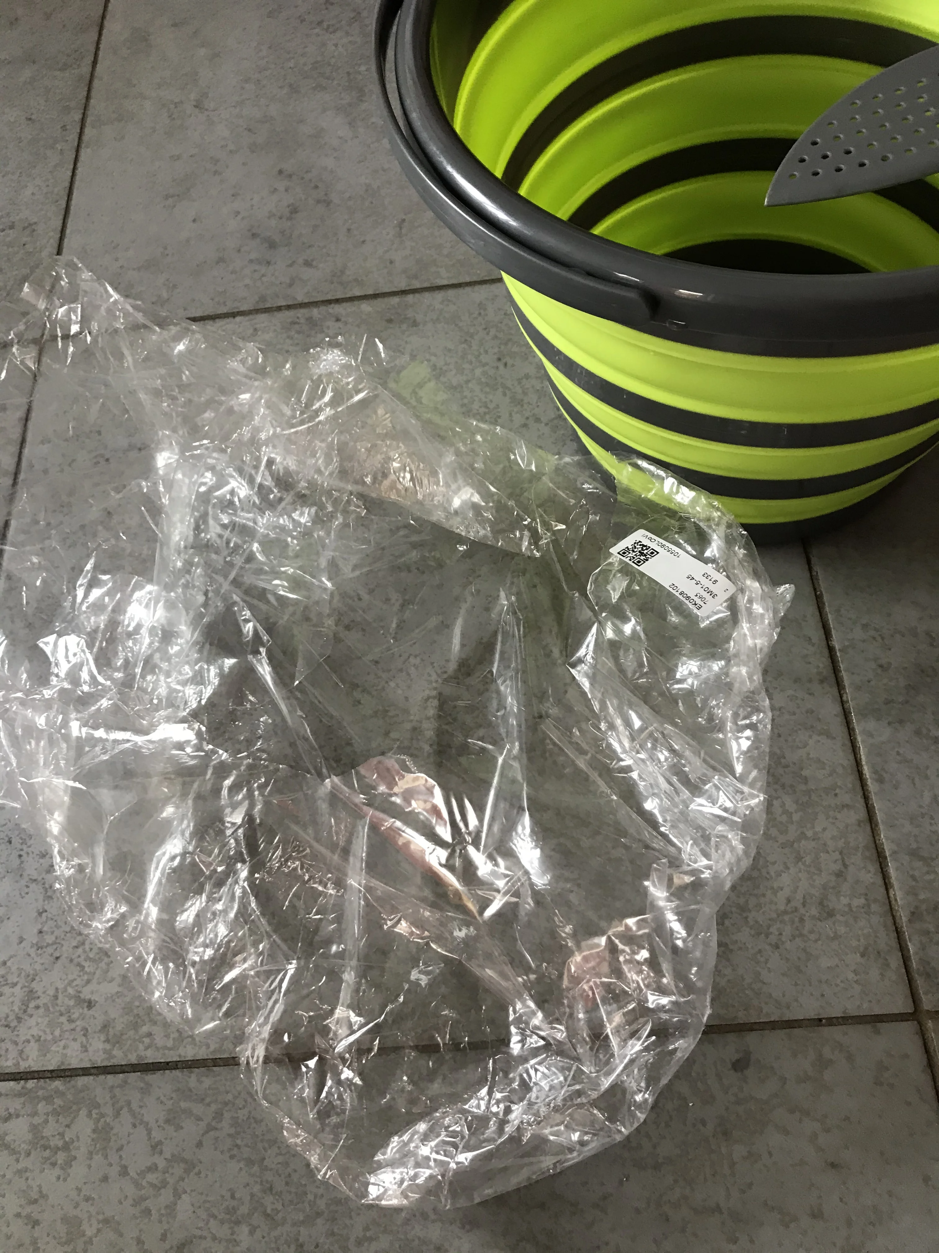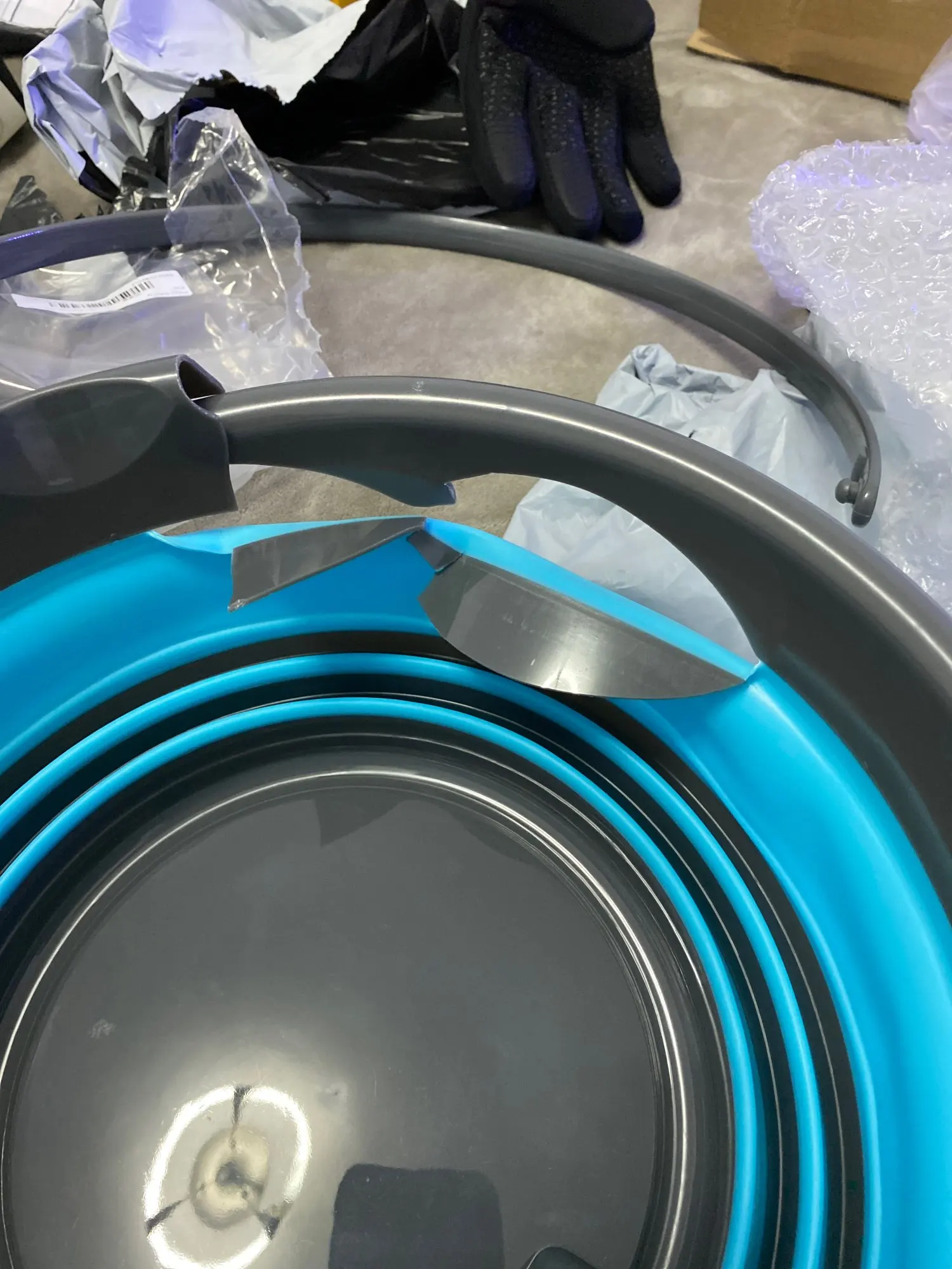 ведро пришло хорошо упаковано. все целое. пластиковые кольца-каркас. В развернутом виде держит форму. покупкой довольна. заказ отслеживался. пришел быстро