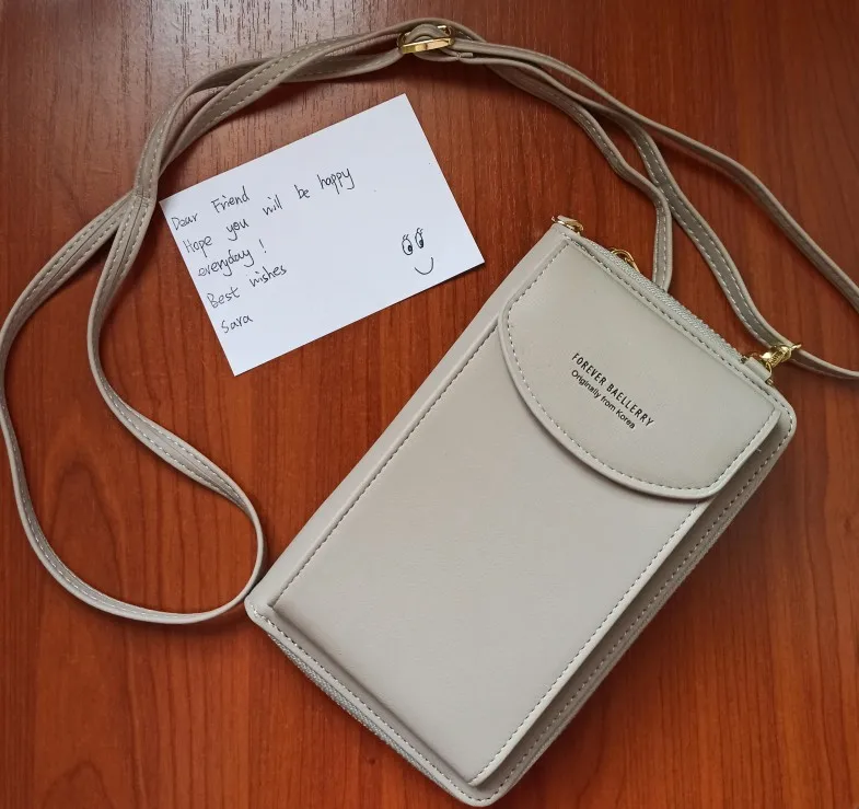 Ооочень симпатичная сумочка! Отправка/доставка быстрая, с учётом объединения с другими посылками - 16 дней. Для владельцев больших смартов стоит учитывать, что кармашек для них не предусмотрен) у меня Redmi note 8 pro, в ширину вместился, а вот в длину не хватило сантиметра)) но впечатление это не испортило, буду носить в отделении с молнией) туда помещается!)) Цвет у меня серый, но не чистый, отдает в беж. Товар рекомендую, однозначно. Ещё и записка продавца, от руки - прелесть!!!