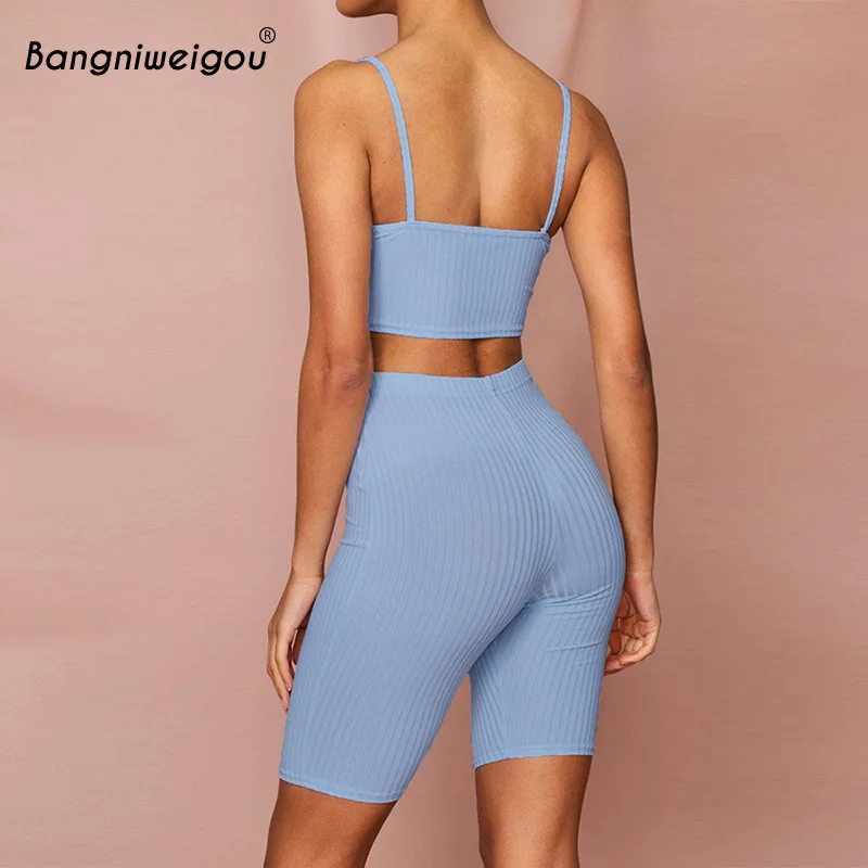 Bangniweigou Повседневный Топ на бретельках и велосипедные шорты Комплект для тренировок Женская обтягивающая эластичная одежда для фитнеса вязаный спортивный комплект из двух предметов синего цвета
