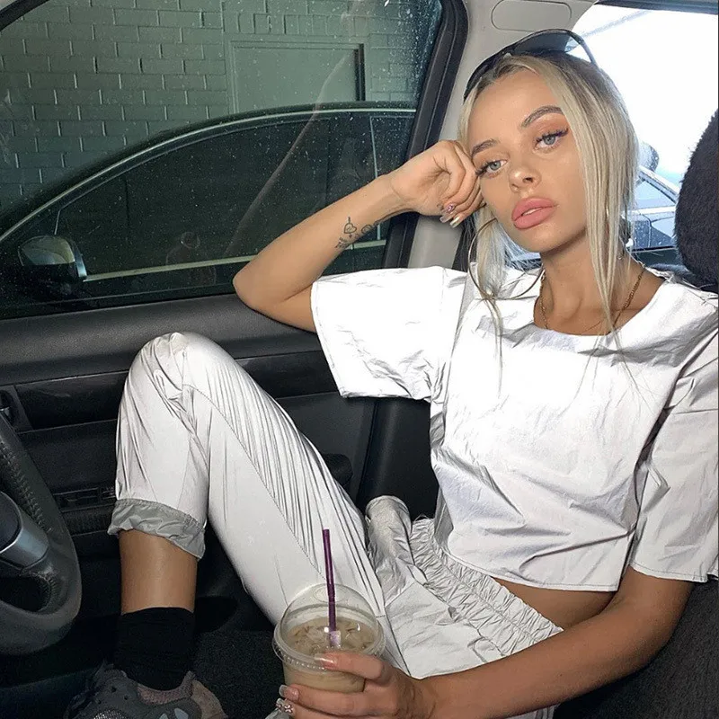 Костюм женский светоотражающий повседневный, блестящая светящаяся футболка и шорты, крутая Уличная Одежда для танцев в стиле хип-хоп, 2 предмета