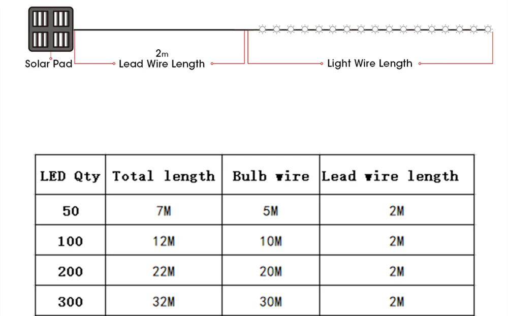 * Светодиодный цвет: теплый белый/многоцветный (4 цвета)* Входное напряжение: 3 в* Источник питания: Солнечная* Общая длина: 7 м (600 мАч/2 режима)/12 м (600 мАч/8 режимов)/22 м (800 мАч/8 режимов)/32 м (1200 мАч/8 режимов)* Количество светодиодный: 50 светодиодный s /100 светодиодный s / 200 светодиодный s/300 светодиодный s* Материал проволоки: мягкий пластиковый канат, мягкий и гибкий, шпагат в любом месте, которое вы можете себе представить.