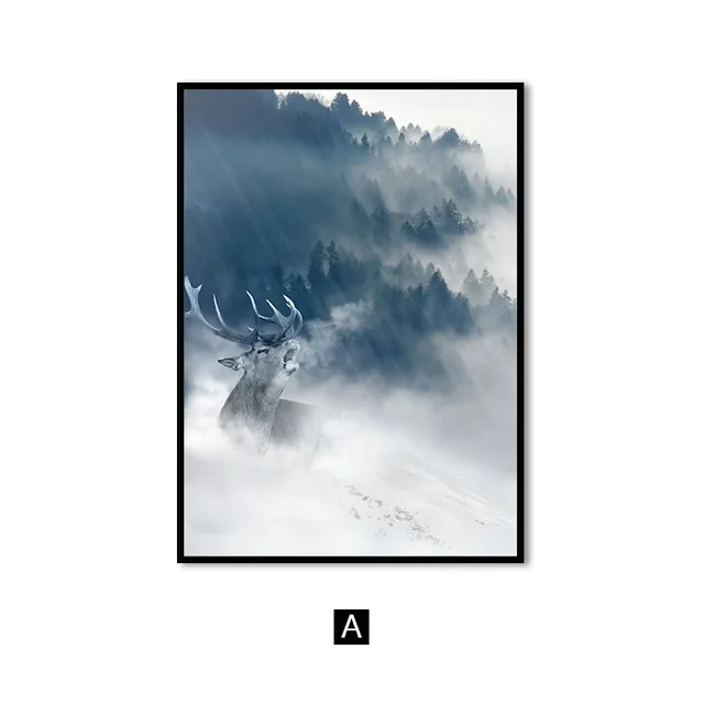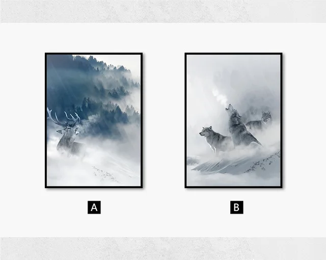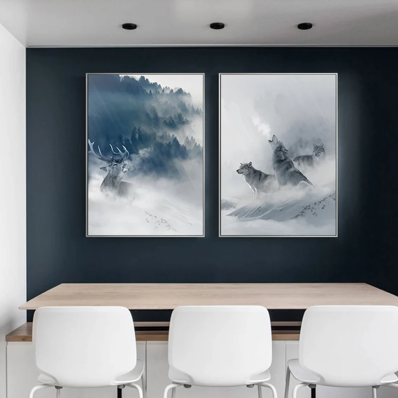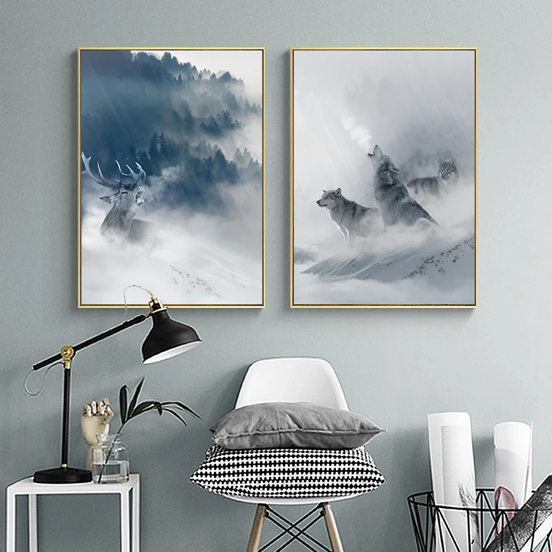 Скандинавское искусство туманное животное Лес Снег горы плакат волк...