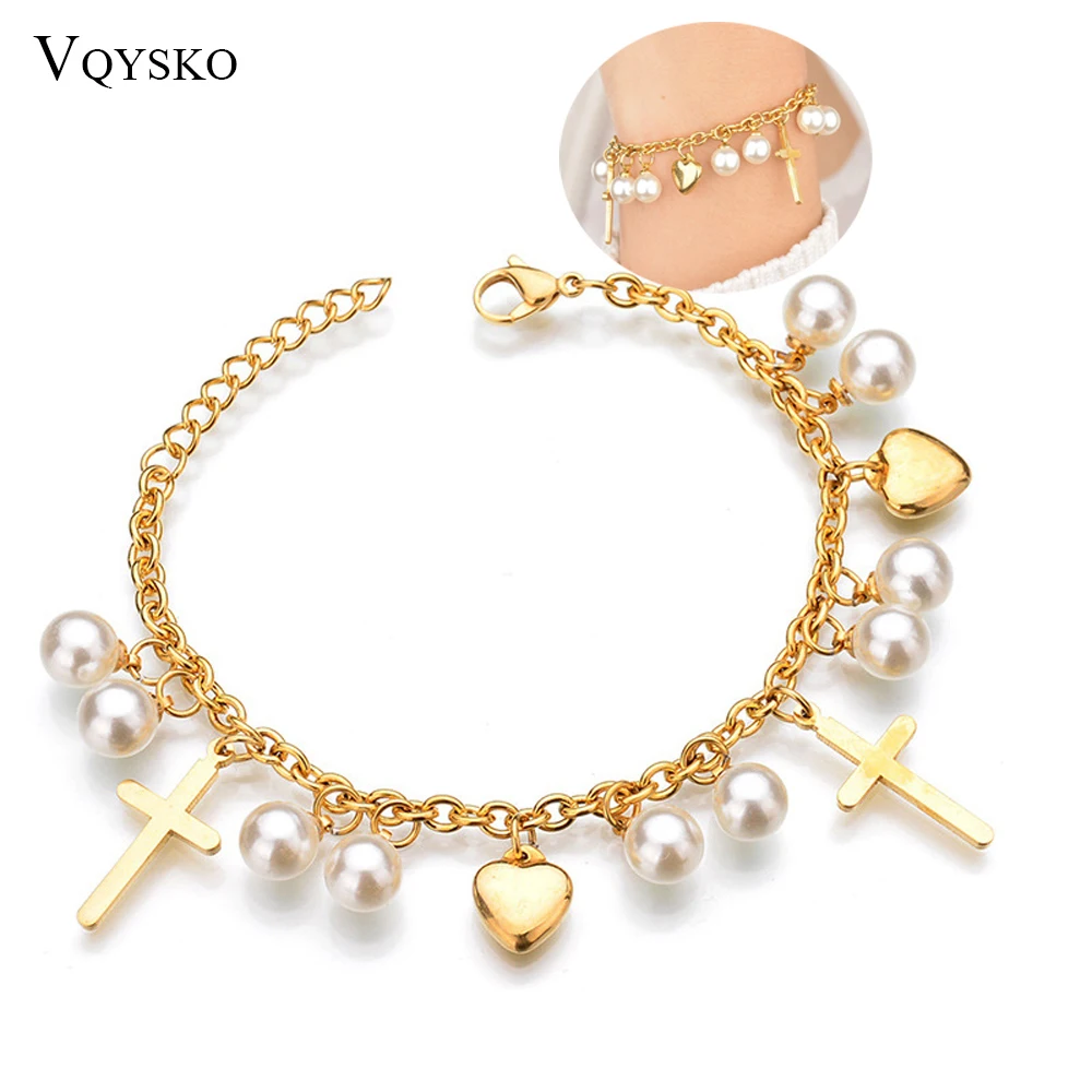 Женский браслет из нержавеющей стали, браслет золотого цвета с подвеской в форме сердца, с жемчугом и крестом, модные христианские ювелирные украшения